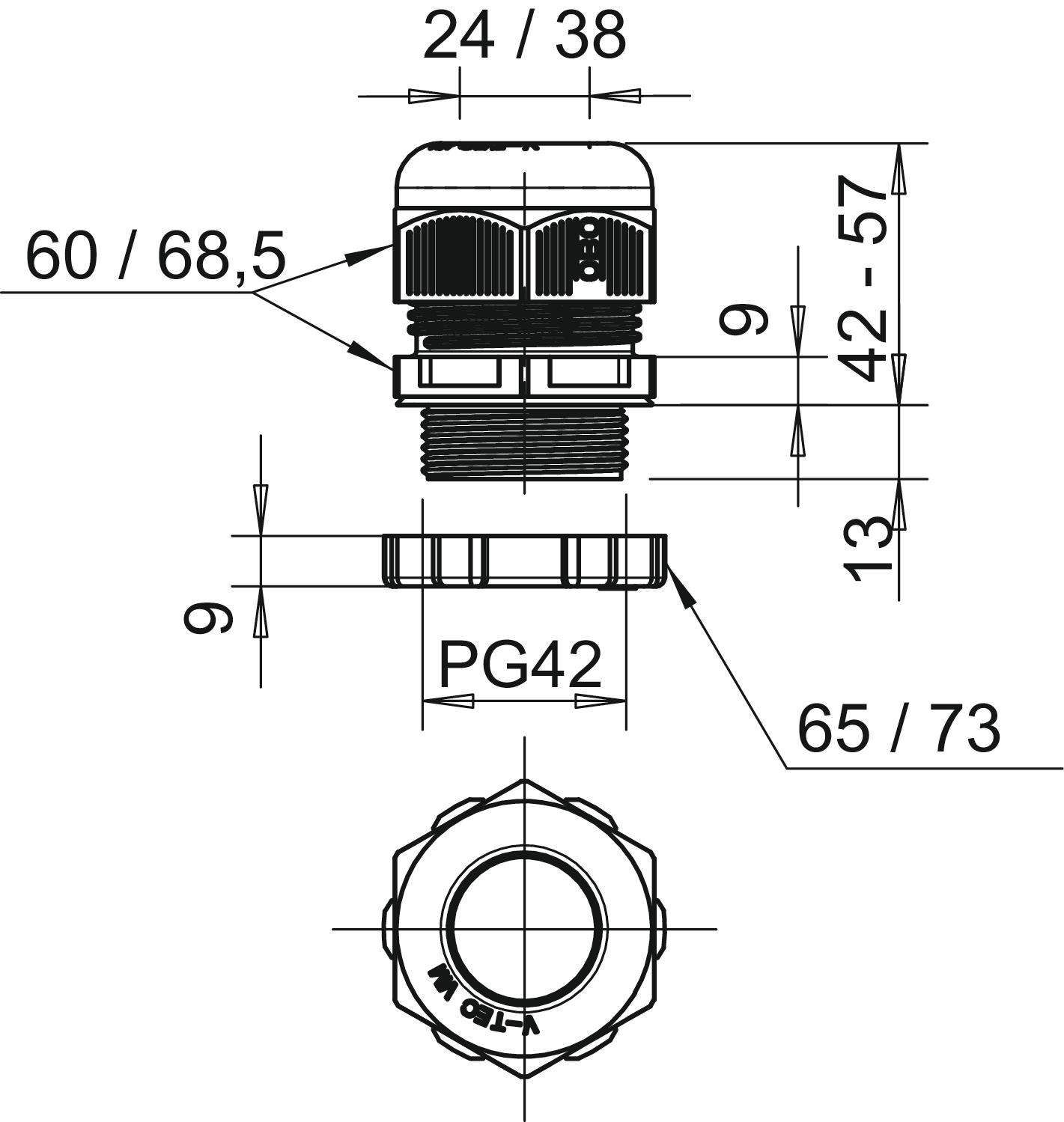 Área de vedação D mín. 24 mm Bucim para cabos planos não Bucim separável não Capacidade de vedação D máx. 38 mm Com porca sim Comprimento da rosca 13 mm Cor cinzento claro; RAL 7035 Dimensão PG42 Gama de temperaturas de aplicação máx. 65 °C Gama de temperaturas de aplicação mín. -20 °C Grau de proteção IP68 Largura da chave 1 60 mm Largura da chave 2 65 mm Livre de halogéneos sim Material Poliamida Medida E1 (mm) 68,5 mm Medida E2 73 mm Medida L máx. 57 mm Medida L mín. 42 mm Medida L1 13 mm Medida L2 9 mm Medida L3 6 mm para zona Ex com gás sem para zona Ex com poeira sem Para zonas potencialmente explosivas sem Passa cabos múltiplo não Passo de rosca 1,5 mm Pegada de CO2 (GWP) do berço ao portão 0,4985 kg CO2e / 1 Peça Possibilidade de alívio de tensão sim Potegido contra explosões não Proteção contra flexão não Reforçado a fibra de vidro não Resistente não Rosca Pg 42 Sextavado Largura entre cantos 68,5 mm Tamanho nominal da rosca 42 Tipo de rosca PG Tipo de vedação Anel de vedação Versão reta - Todos os tipos