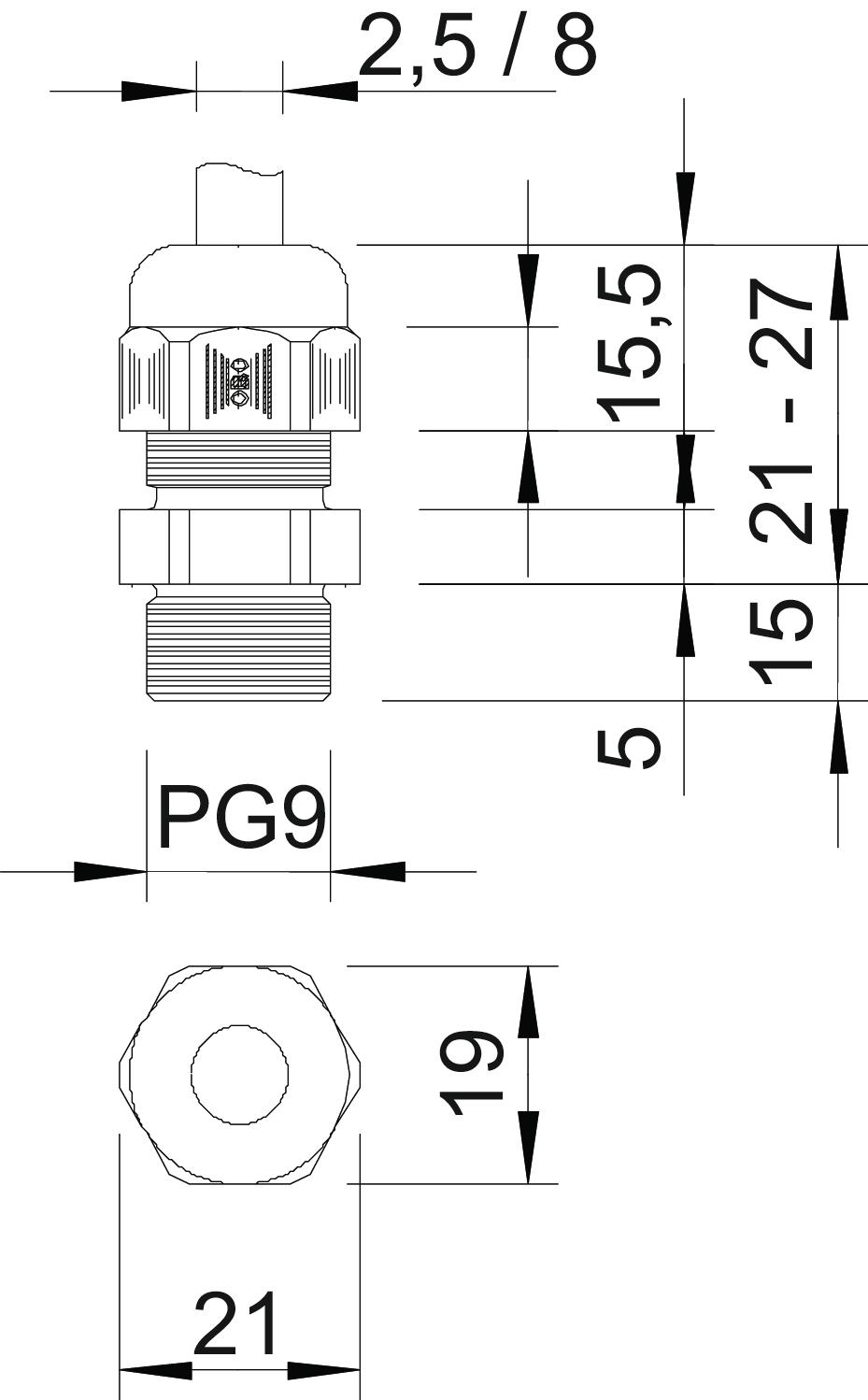 Área de vedação D mín. 2,5 mm Binário instável 2,5 Nm Bucim para cabos planos não Bucim separável não Capacidade de vedação D máx. 8 mm Com porca não Comprimento da rosca 15 mm Cor cinzento prateado; RAL 7001 Dimensão PG9 Gama de temperaturas de aplicação máx. 65 °C Gama de temperaturas de aplicação mín. -20 °C Grau de proteção IP68 Largura da chave 19 Livre de halogéneos sim Material Poliamida Medida E 21 mm Medida L máx. 27 mm Medida L mín. 21 mm Medida L1 15 mm Medida L2 5 mm Medida L3 15,5 mm para zona Ex com gás sem para zona Ex com poeira sem Para zonas potencialmente explosivas sem Passa cabos múltiplo não Passo de rosca 1,5 mm Pegada de CO2 (GWP) do berço ao portão 0,0362 kg CO2e / 1 Peça Possibilidade de alívio de tensão sim Potegido contra explosões não Proteção contra flexão não Reforçado a fibra de vidro não Resistente não Rosca Pg 9 Sextavado Largura entre cantos 21 mm Tamanho nominal da rosca 9 Tipo de rosca PG Tipo de vedação Anel de vedação Versão reta - Todos os tipos