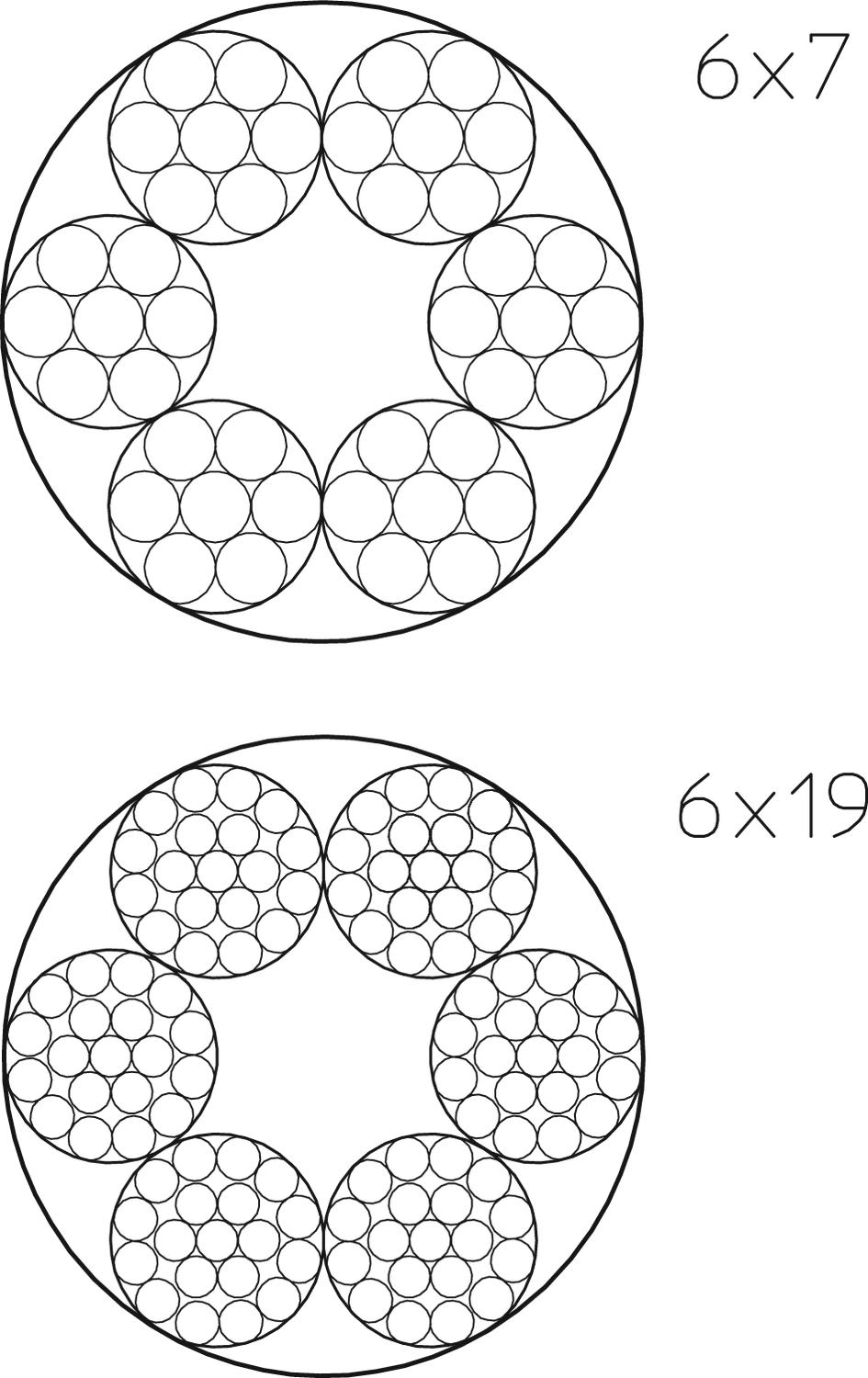 Cabo Ø 2 - 6 mm: Cabo de tração de secção circular 6 x 7 conforme a DIN 3055.