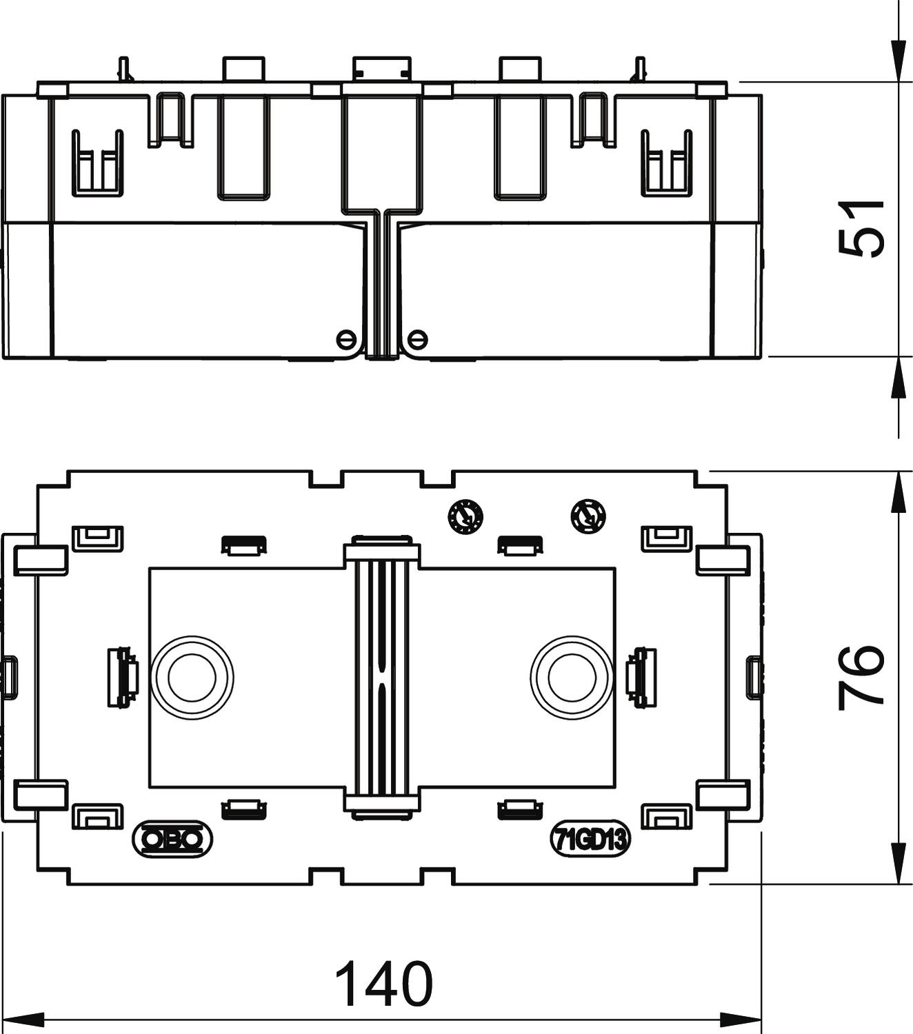 Descrição do produtoCaixa de aparelhagem dupla de encaixe frontal para sistema Modul 45®, com parte inferior articulada e, se necessário, amovível para a rápida ligação de cabo, com entradas para cabos com diâmetro até 14 mm.