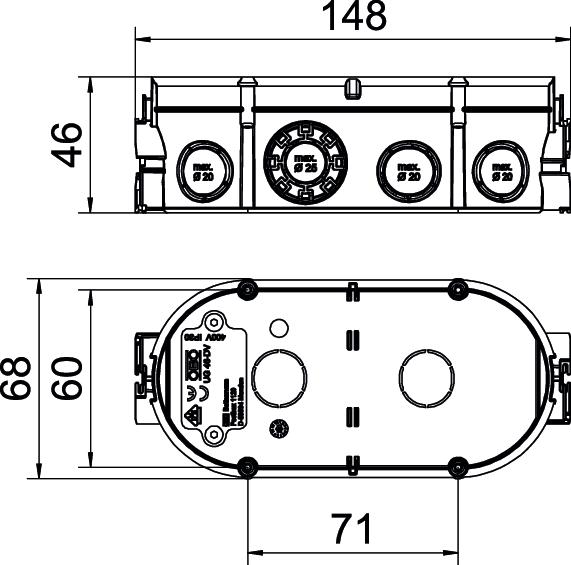Altura 46 mm Com parafusos não Comprimento 148 mm Cor preto negro / azul acinzentado Dimensão 2x Ø60xH46mm Entrada pela parte de trás sim Entradas combinadas Ø 20 / 25 mm 4 Entradas de tubos Ø 20 mm 8 Fixação da tampa Parafusos Fixação dos aparelhos Parafusos ou garras de expansão Forma oval Grau de proteção IP 30 Hermético não Largura 68 mm Livre de halogéneos sim Material Polipropileno Número de entradas 12 para diâmetro de tubo 20/25 mm Pegada de CO2 (GWP) do berço ao portão 0,0908 kg CO2e / 1 Peça resistência ao fio incandescente conforme a VDE 0471/IEC 60695-2-11, temperatura de ensaio 650°C Resistente não Secção transversal nominal máx. 2,5 mm² Secção transversal nominal mín. 1,5 mm² Tampa sem Tensão nominal 400 V Tipo de entrada Cabos NYM, cabos de dados e tubos corrugados Tipo de versão da caixa Aberturas destacáveis - Todos os tipos