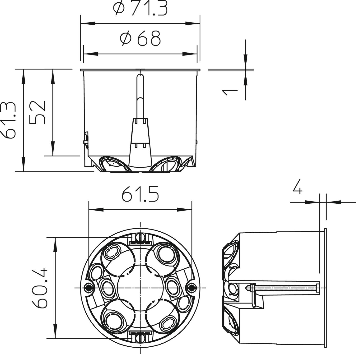 Descrição do produtoCaixa de aparelhagem funda para parede oca. Dimensões conforme a DIN 49073-1, para espessuras de placa de 7 - 35 mm. Distância normalizada combinada de 71 mm, possibilidade de cablagem com auxílio dos suportes de ligação em combinações entre caixas de aparelhagem e caixas de derivação, 8 entradas destacáveis para cabos NYM, cabos de dados e tubos com Ø 20 mm, caixas de aparelhagem também podem ser aplicadas como caixas de derivação conforme a VDE 0606-1 com fixação roscada dupla e tampa de enroscar, tipo de proteção IP30.