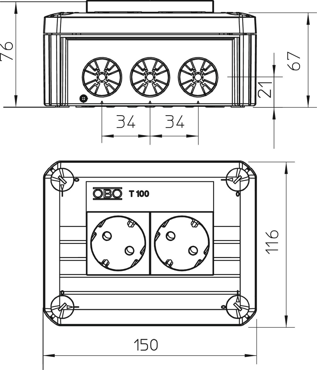 Caixa de derivação T 100 4 tomadas Modul 45 na tampa, 2 polos