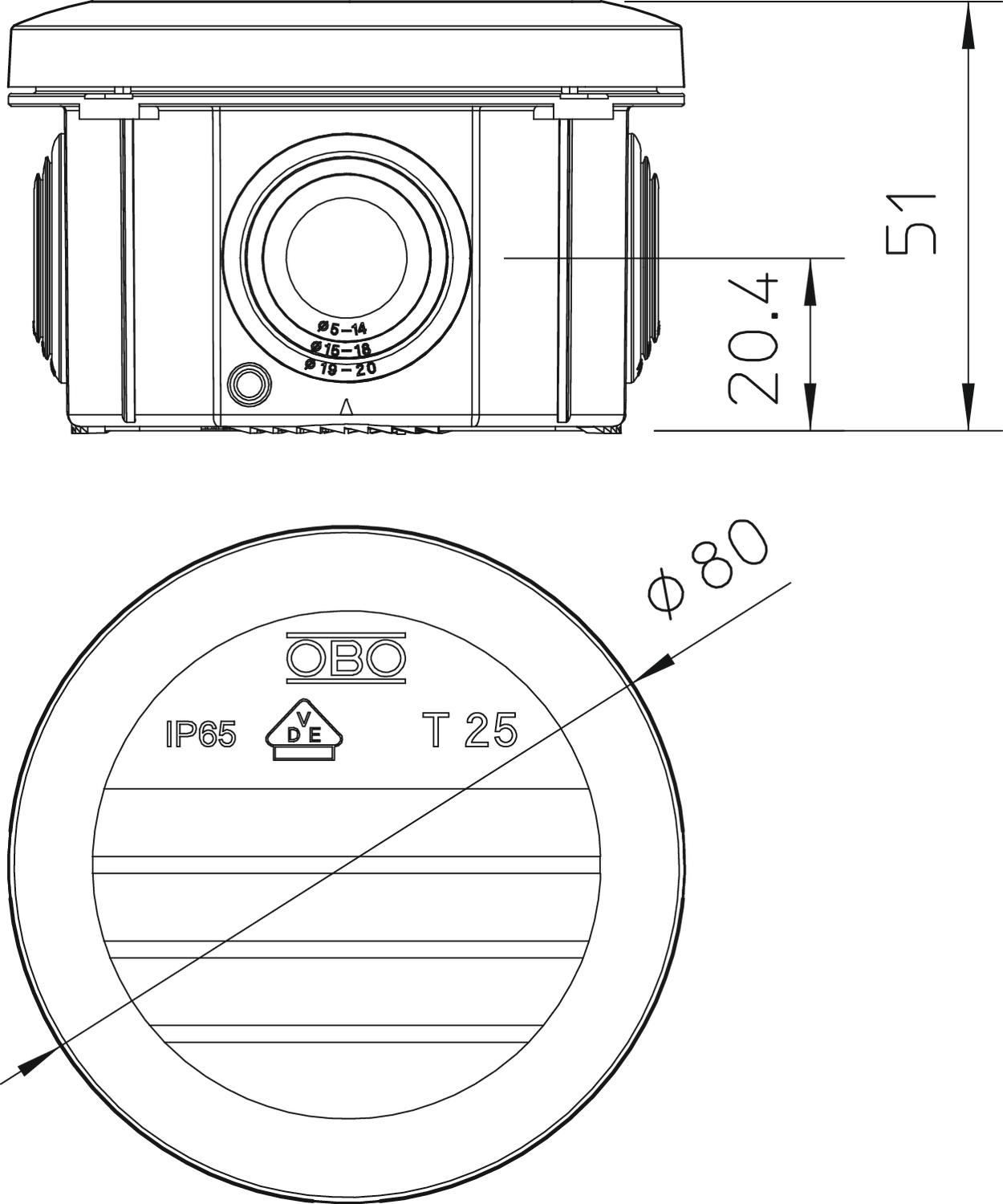 Descrição do produtoCaixa de derivação para conectar cabos em áreas interiores e áreas exteriores protegidas. Forma redonda com bucins cónicos nas laterais e entradas quebráveis no base. Adequado para a montagem na parede e teto, a montagem em suportes para caixas de derivação e na base da caixa. Com opção de fixação interna. Com tampa de aperto fixa. Fabricada em materiais resistentes aos raios UV e livres de halogéneo. Caixa de derivação de acordo com a DIN EN 60670. Resistente ao fio incandescente segundo a DIN EN 60695-2-11, temperatura de ensaio 650 °C. Resistência ao impacto IK07 de acordo com a DIN EN 50102.