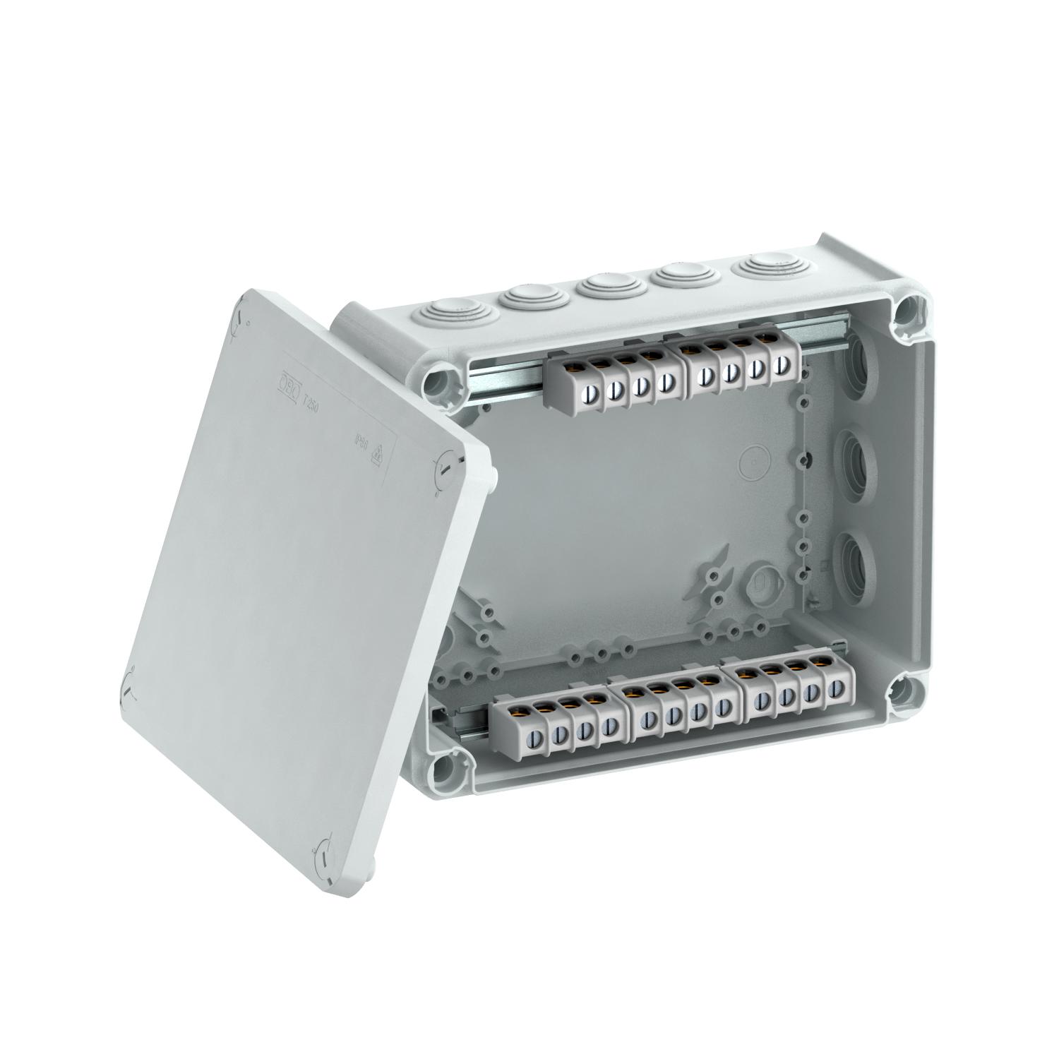Descrição do produtoCaixa de derivação com régua de bornes para conectar cabos em áreas interiores e áreas exteriores protegidas. Forma retangular com bucins cónicos nas laterais e entradas quebráveis na base. Adequado para a montagem na parede e teto, a montagem em suportes para caixas de derivação e na base da caixa. Com opção de fixação interna e montagem através de parafusos nos cantos. Tampa com fecho rápido, pode ser selada a chumbo. Fabricada em materiais resistentes aos raios UV e livres de halogéneo. Caixa de derivação de acordo com a DIN EN 60670. Resistente ao fio incandescente segundo a DIN EN 60695-2-11, temperatura de ensaio 650 °C. Resistência ao impacto IK05 de acordo com a DIN EN 50102.