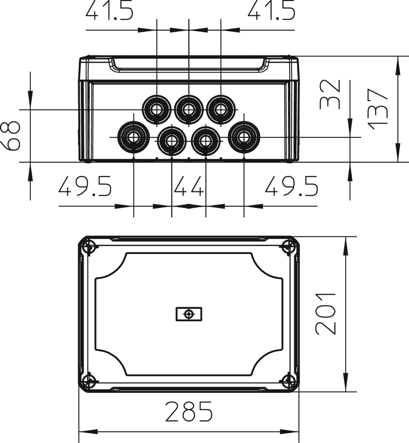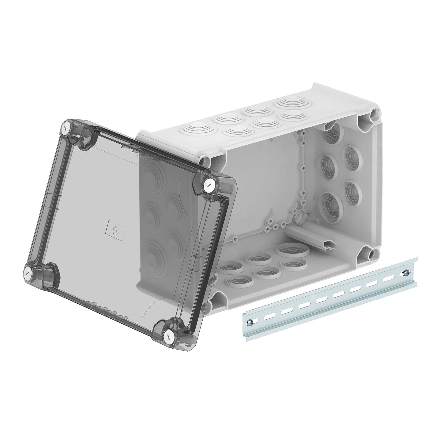 Descrição do produtoCaixa de derivação para conectar cabos em áreas interiores e áreas exteriores protegidas. Forma retangular com bucins cónicos. Adequado para a montagem na parede e teto, a montagem em suportes para caixas de derivação e na base da caixa. Com opção de fixação interna e montagem através de parafusos nos cantos. Tampa alta, transparente, com fecho rápido, pode ser selada a chumbo. Fabricada em materiais resistentes aos raios UV e livres de halogéneo.