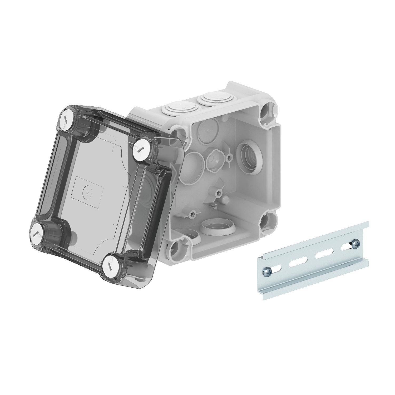 Descrição do produtoCaixa de derivação para conectar cabos em áreas interiores e áreas exteriores protegidas. Forma quadrada com bucins cónicos nas laterais e entradas quebráveis na base. Adequado para a montagem na parede / teto e para a montagem em suportes para caixas de derivação. Com opção de fixação interna e montagem através de parafusos nos cantos. Tampa alta, transparente, com fecho rápido, pode ser selada a chumbo. Fabricada em materiais resistentes aos raios UV e livres de halogéneo.