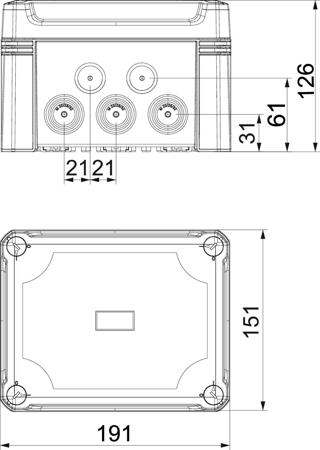 Descrição do produtoCaixa de derivação para conectar cabos e tubos em áreas interiores e exteriores. Forma retangular com entradas quebráveis. Adequado para montagem na parede e teto com opção para fixação externa ou montagem através de parafusos nos cantos. Particularmente resistente ao impacto com IK09. Tampa com fecho rápido, pode ser selada a chumbo. Fabricada em materiais resistentes aos raios UV e livres de halogéneo.