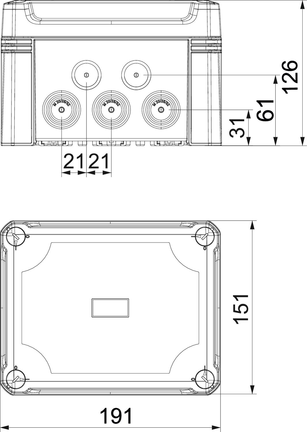 Descrição do produtoCaixa de derivação com calha DIN para conectar cabos e tubos em áreas interiores e exteriores. Forma retangular com entradas quebráveis. Adequado para montagem na parede e teto com opção para fixação externa ou montagem através de parafusos nos cantos. Particularmente resistente ao impacto com IK09. Tampa transparente com fecho rápido, pode ser selada a chumbo. Fabricada em materiais resistentes aos raios UV e livres de halogéneo.