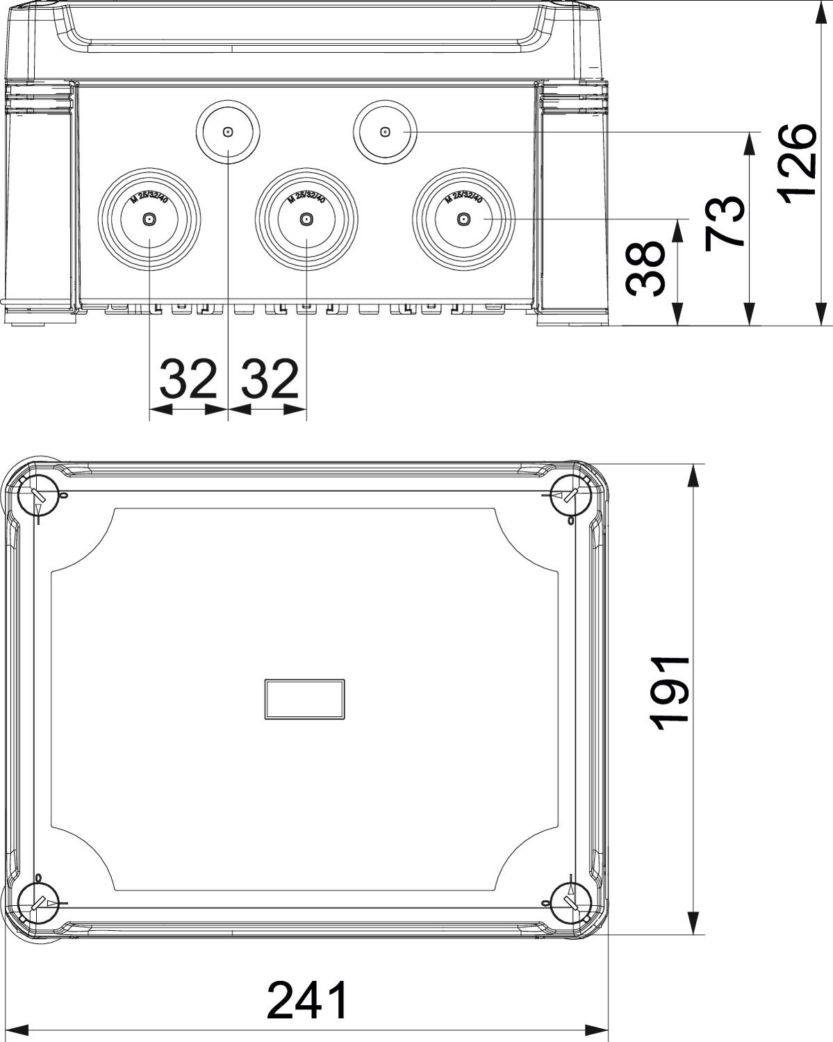 Descrição do produtoCaixa de derivação para conectar cabos e tubos em áreas interiores e exteriores. Forma retangular com entradas quebráveis. Adequado para montagem na parede e teto com opção para fixação externa ou montagem através de parafusos nos cantos. Particularmente resistente ao impacto com IK09. Tampa com fecho rápido, pode ser selada a chumbo. Fabricada em materiais resistentes aos raios UV e livres de halogéneo.
