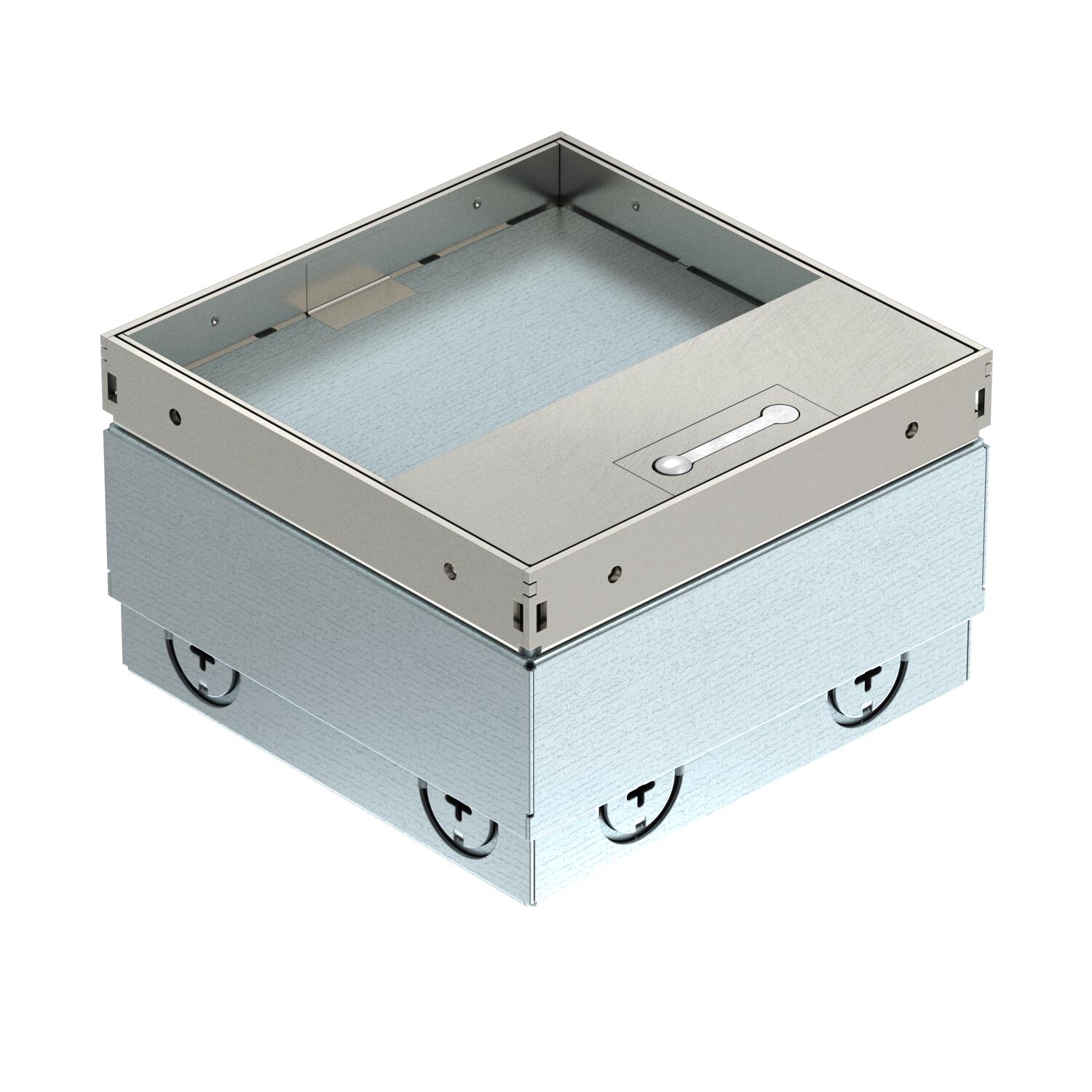 Descrição do produtoCaixa de pavimento quadrada para utilização em chão falso com limpeza a seco e betonilha em áreas interiores. Caixa com aberturas de entrada para tubos (M20/M25). Tampa ajustável ao rebordo superior do revestimento do pavimento, através de 4 apoios de nivelamento. A profundidade mínima de instalação é de 110 mm, nivelamento de + 25 mm. Estrutura e tampa de aço inoxidável visível no revestimento do pavimento. Tampa com abertura para o revestimento do piso e saída de cabos com escova. A capacidade de carga de 15 kN só é garantida quando não está a ser utilizada. Caixa vazia para até 2 aparelhagens Modul 45® no espelho e 2 conectores de dados no suporte de montagem opcional.