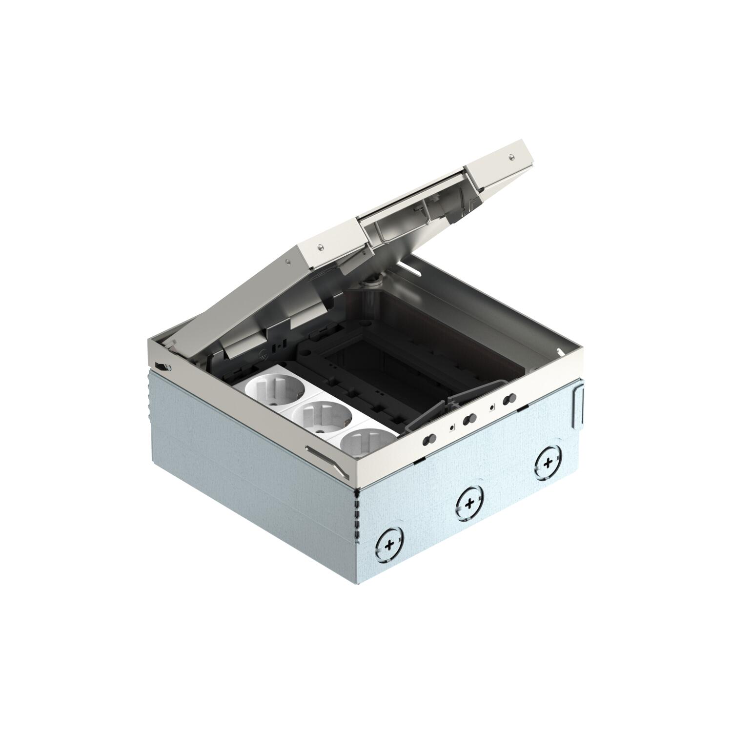 Descrição do produtoCaixa de pavimento quadrada para utilização em chão falso de limpeza a seco e betonilha em áreas interiores. Caixa com aberturas de entrada para tubos (M25). Com 2 suportes universais UT3 45 3 e uma tomada de contacto de segurança tripla. Tampa ajustável ao rebordo superior do revestimento do pavimento, através de 4 apoios de nivelamento. A profundidade mínima de montagem é de 95 mm, a amplitude de nivelamento + 30 mm.