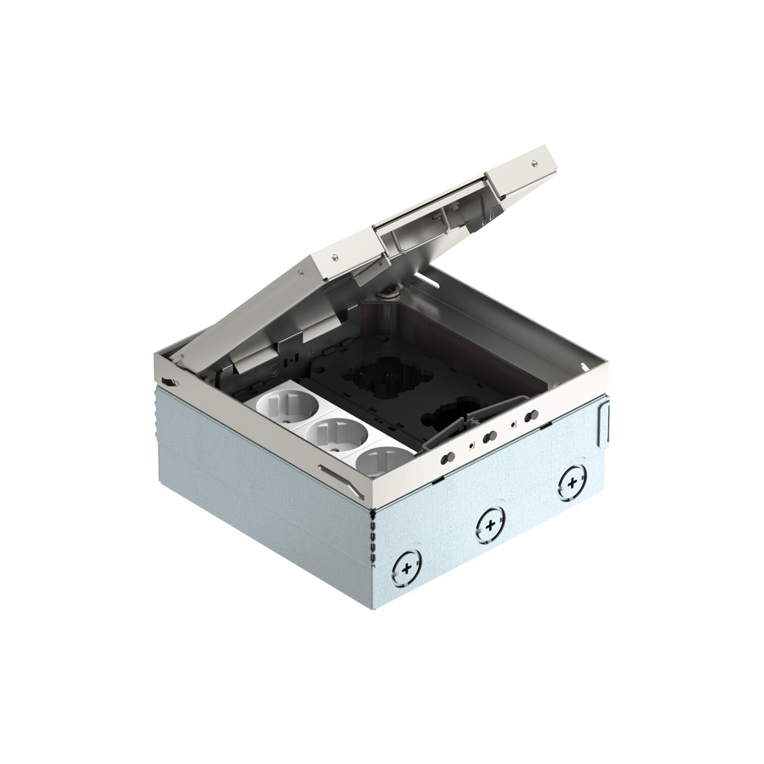 Descrição do produtoCaixa de pavimento quadrada para utilização em chão falso de limpeza a seco e betonilha em áreas interiores. Caixa com aberturas de entrada para tubos (M25). Tampa ajustável ao rebordo superior do revestimento do pavimento, através de 4 apoios de nivelamento. A profundidade mínima de montagem é de 95 mm, a amplitude de nivelamento + 30 mm.