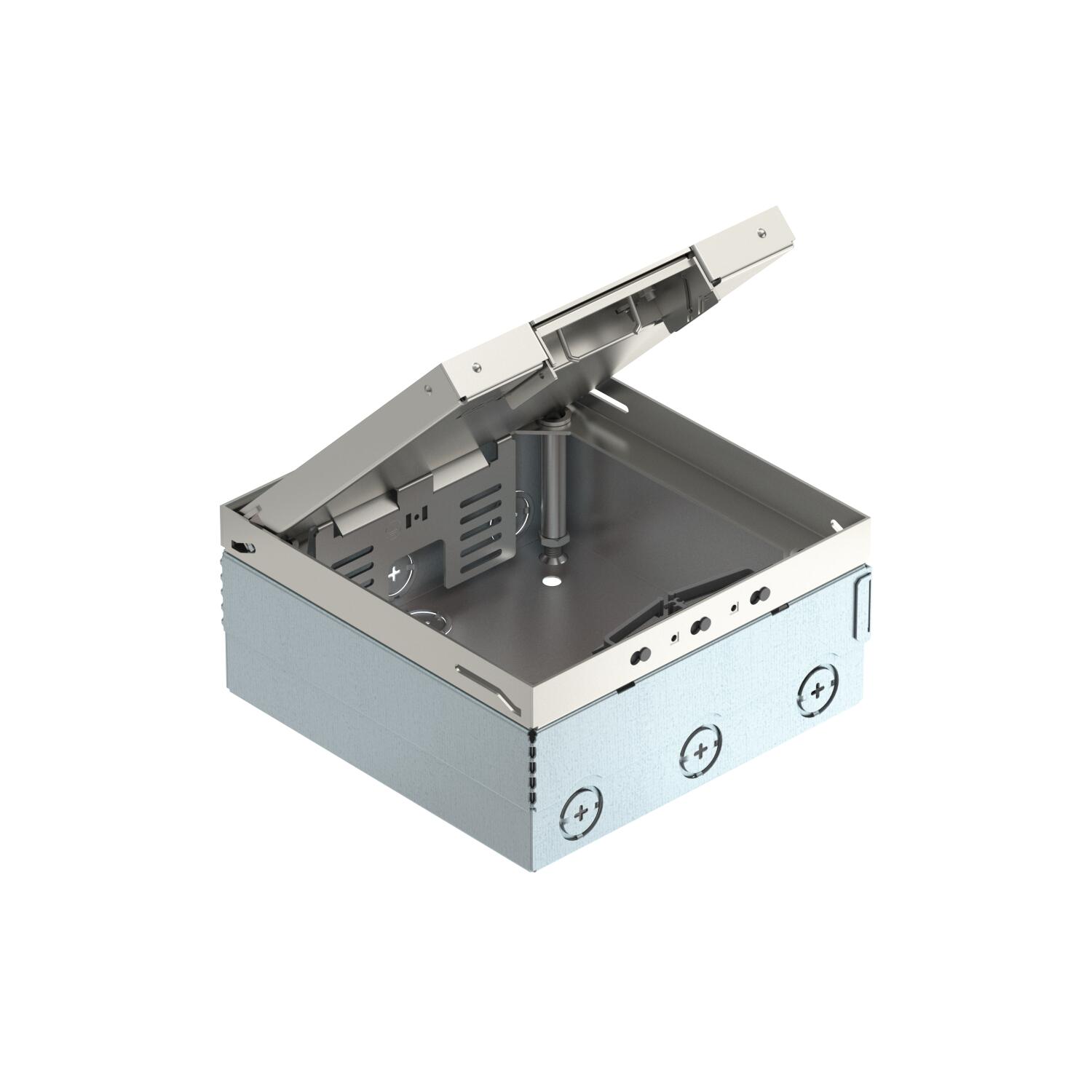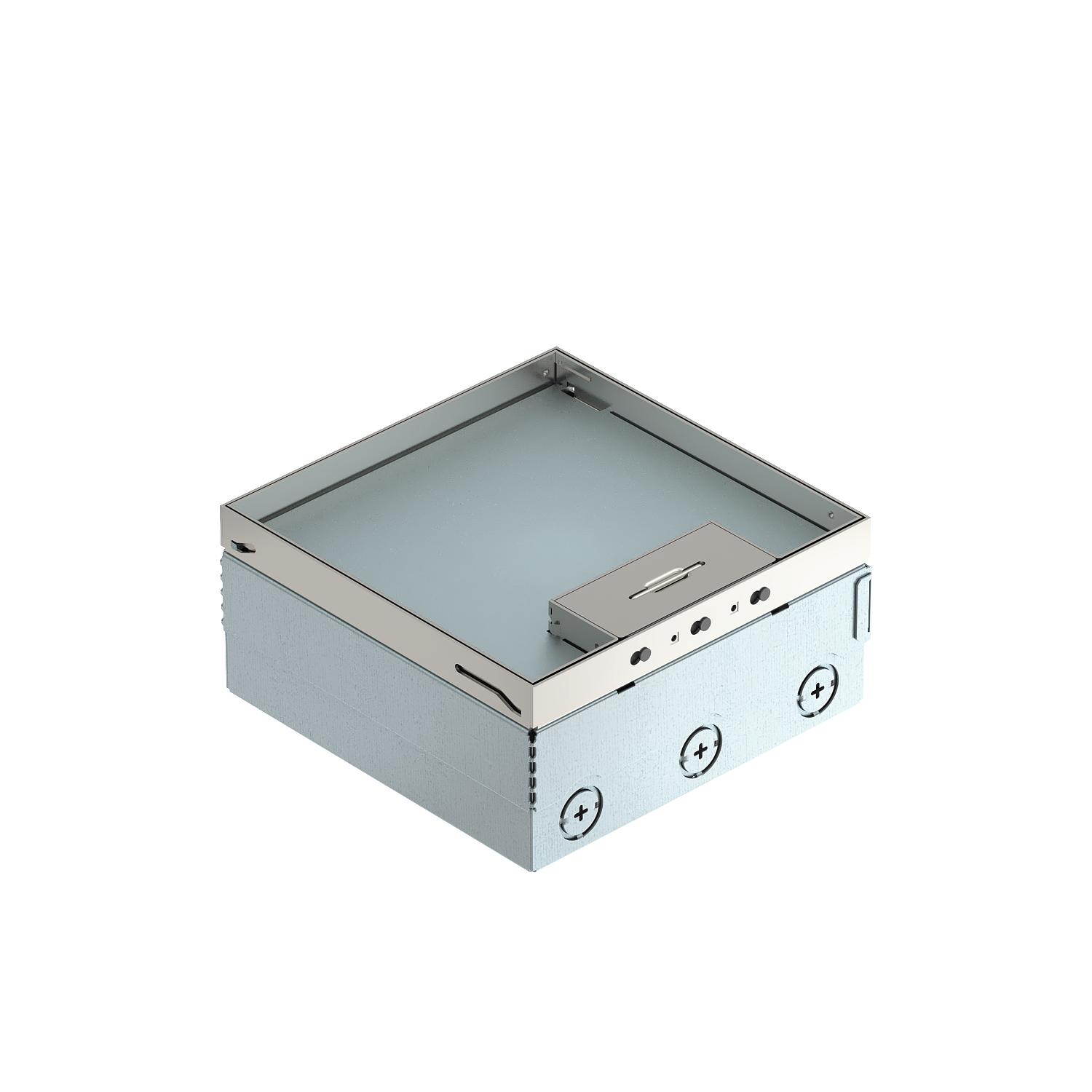Descrição do produtoCaixa de pavimento quadrada para utilização em chão falso de limpeza a seco e betonilha em áreas interiores. Caixa com aberturas de entrada para tubos (M25). Tampa ajustável ao rebordo superior do revestimento do pavimento, através de 4 apoios de nivelamento. A profundidade mínima de montagem é de 95 mm, a amplitude de nivelamento + 30 mm.