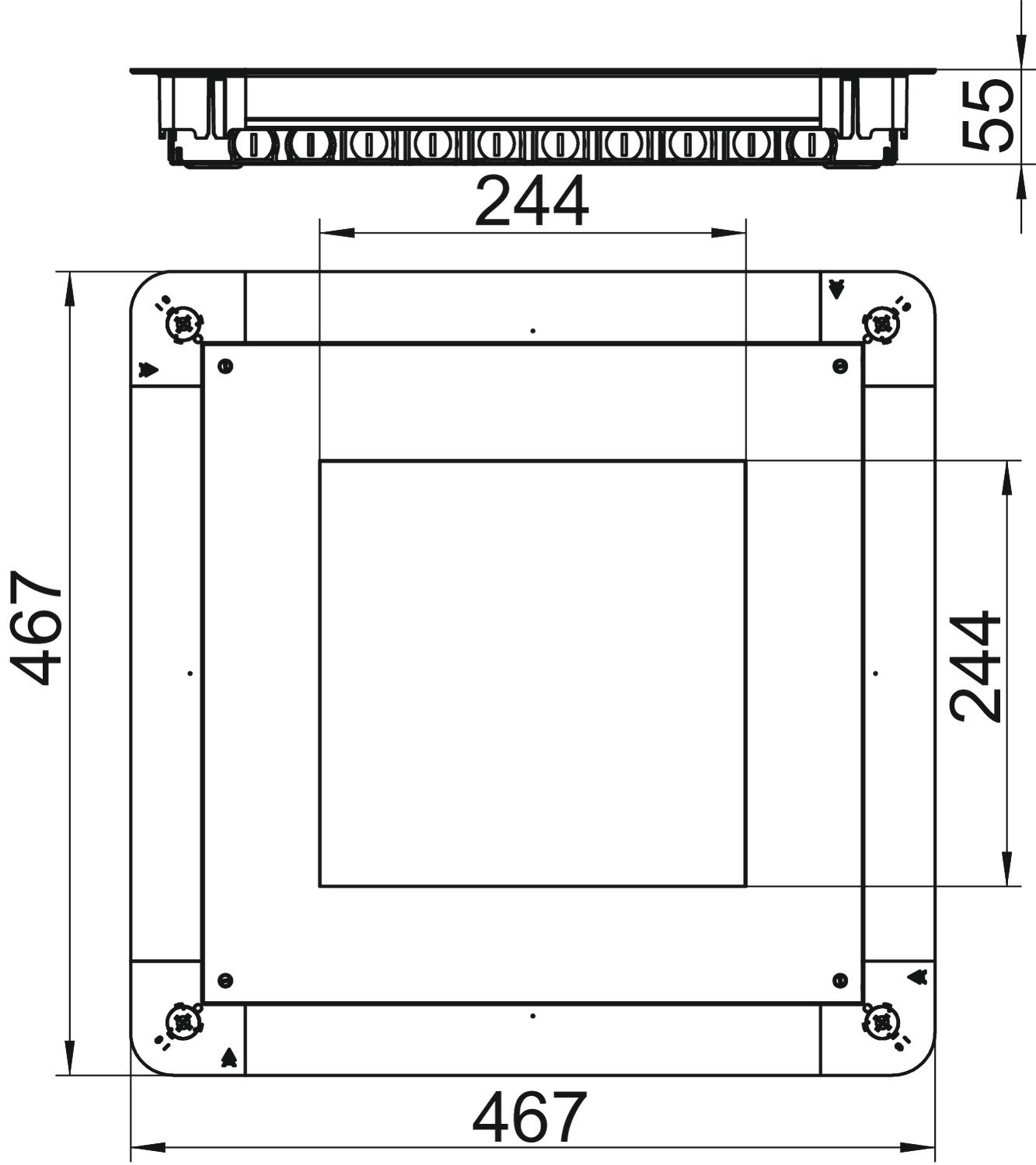 Descrição do produtoCaixa de pavimento com aro de redução e tampa cega com paredes laterais de chapa de aço. Para a instalação de tampa de encastramento quadrada GES9 55 em alturas de pavimento a partir de 55 mm. Pode ser continuamente nivelada até à altura da betonilha e a betonilha pode ser nivelada com a aresta de descarga da betonilha. Com aberturas para tubos de condução de cada lado 7 x M20, 3 x M25, 4 x M32. Tamanho útil do tubo com altura de sistema de 55 mm: M20.