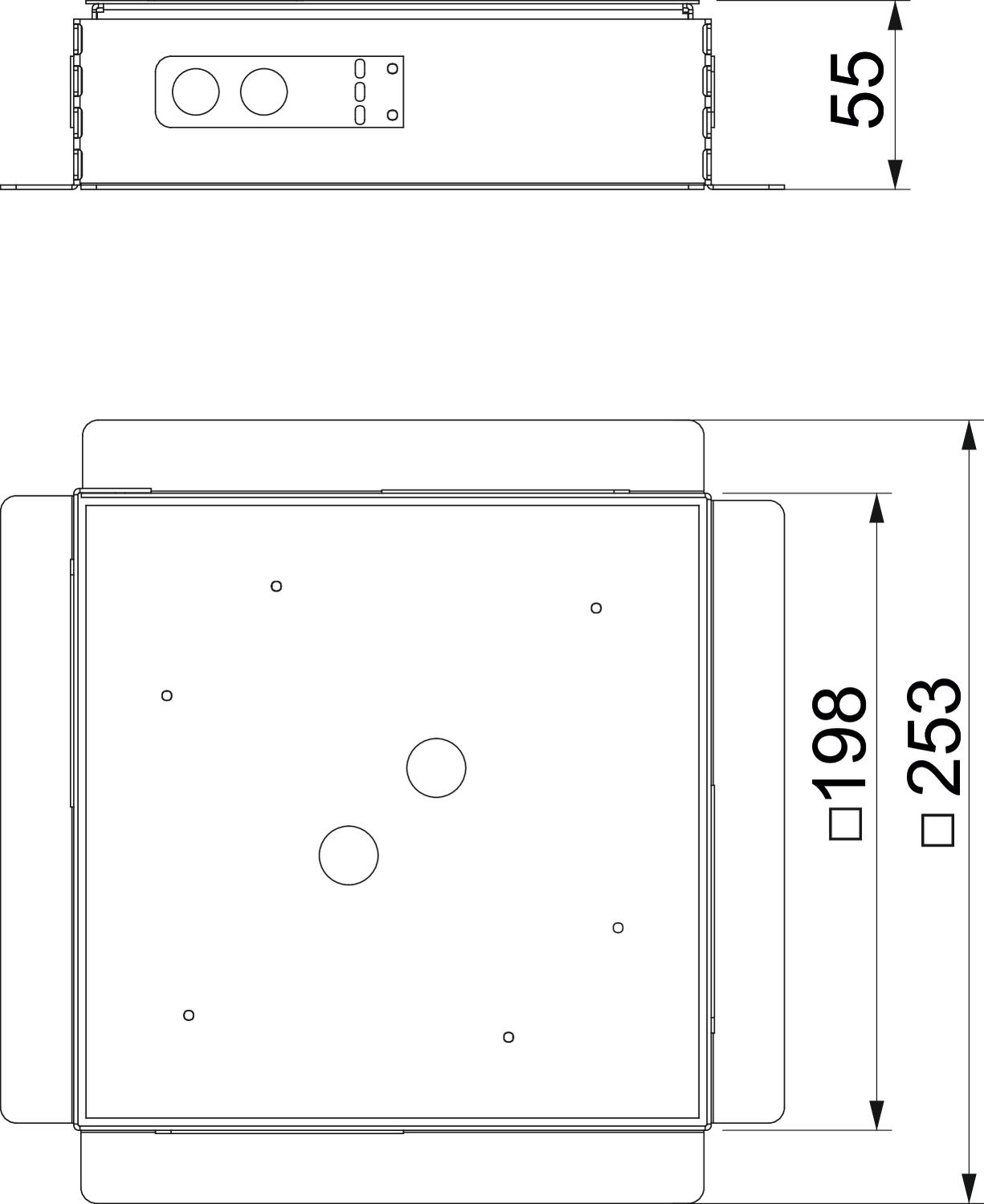 Altura 55 mm Altura máx. do pavimento 200 mm Altura mín. do pavimento 130 mm Comprimento 198 mm Dimensão 253x253x55 Largura 198 mm Material Aço Medida A 253 mm Medida a 198 mm Medida h 55 mm Pegada de CO2 (GWP) do berço ao portão 6,2323 kg CO2e / 1 Peça Superfície galvanizado pelo método Sendzimir Tamanho nominal para unidades de montagem de aparelhos 4 - Todos os tipos