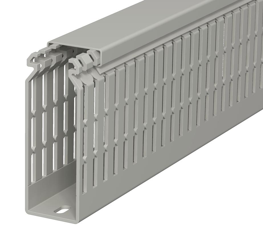 Calha de cablagem conforme a norma DIN EN 50085-2-3 inclui tampa e base perfurada para colocação horizontal e vertical de cabos e linhas elétricas no quadro de distribuição. Versão de calha DIN. A quebra das barras pode ocorrer sem ferramentas. A execução no pavimento é possível através de pontos de rutura nominais. As ranhuras laterais impedem a queda dos cabos. Testado de acordo com a DIN EN 50085-2-3. Comprimentos especiais disponíveis mediante pedido.