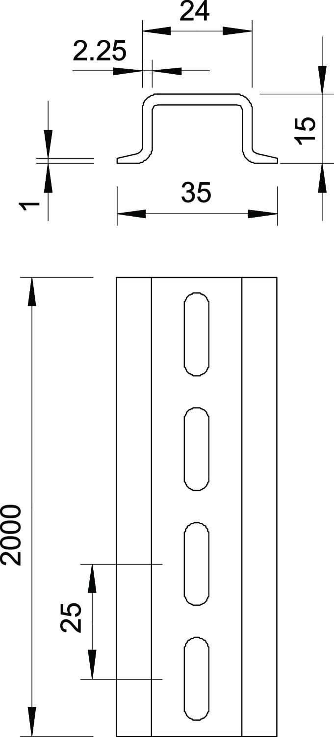 Altura 15 mm Comprimento 2000 mm Dimensão 2000x35x15 Distância cêntrica entre os furos 25 mm Espessura do material 2,25 mm Forma do orifício (ETIM) Ranhura Largura 35 mm Material Aço Molho 20 m Pegada de CO2 (GWP) do berço ao portão 1,6517 kg CO2e / 1 Metro Superfície eletrogalvanizado, passivado transparente Versão perfurado Versão das calhas Calha DIN EN 60715 - Todos os tipos