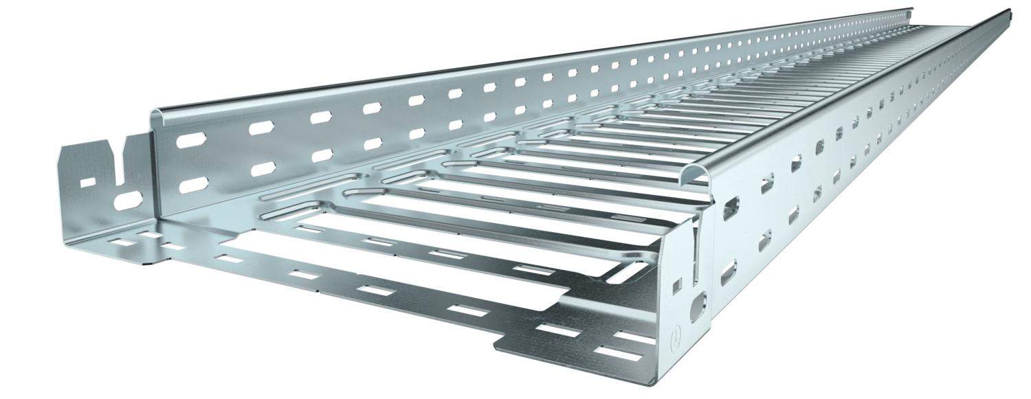 Caminho de cabos com largura de 200 mm com perfuração de 30%, de acordo com a diretriz VdS 2092, adequado para uso em sistemas de aspersão.
