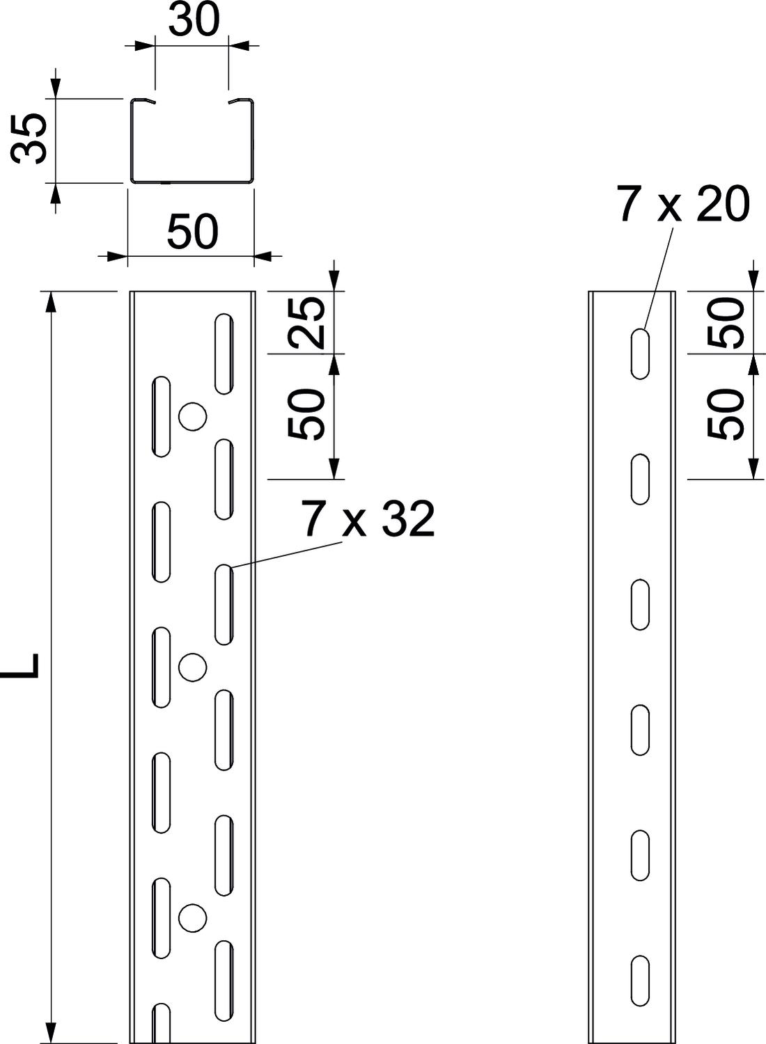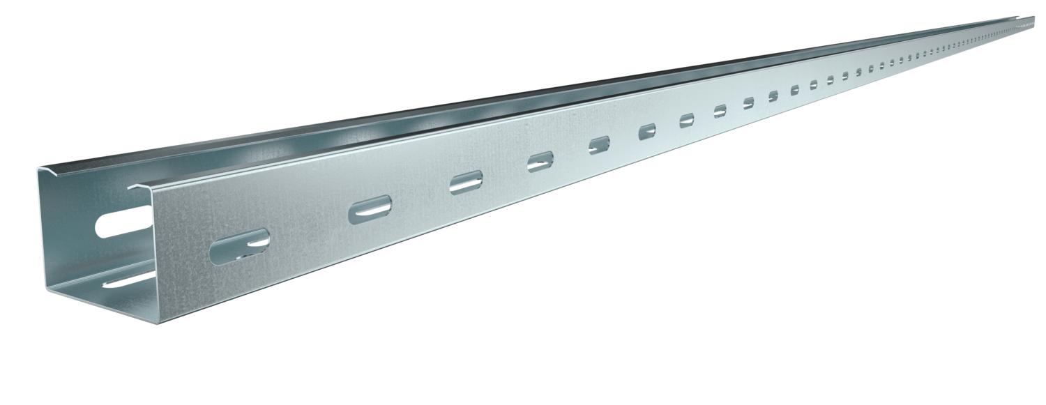 Caminho de cabos em chapa com perfuração continua na base e na lateral, bem como perfuração no meio (Ø11 mm) da base para fixações adicionais.
