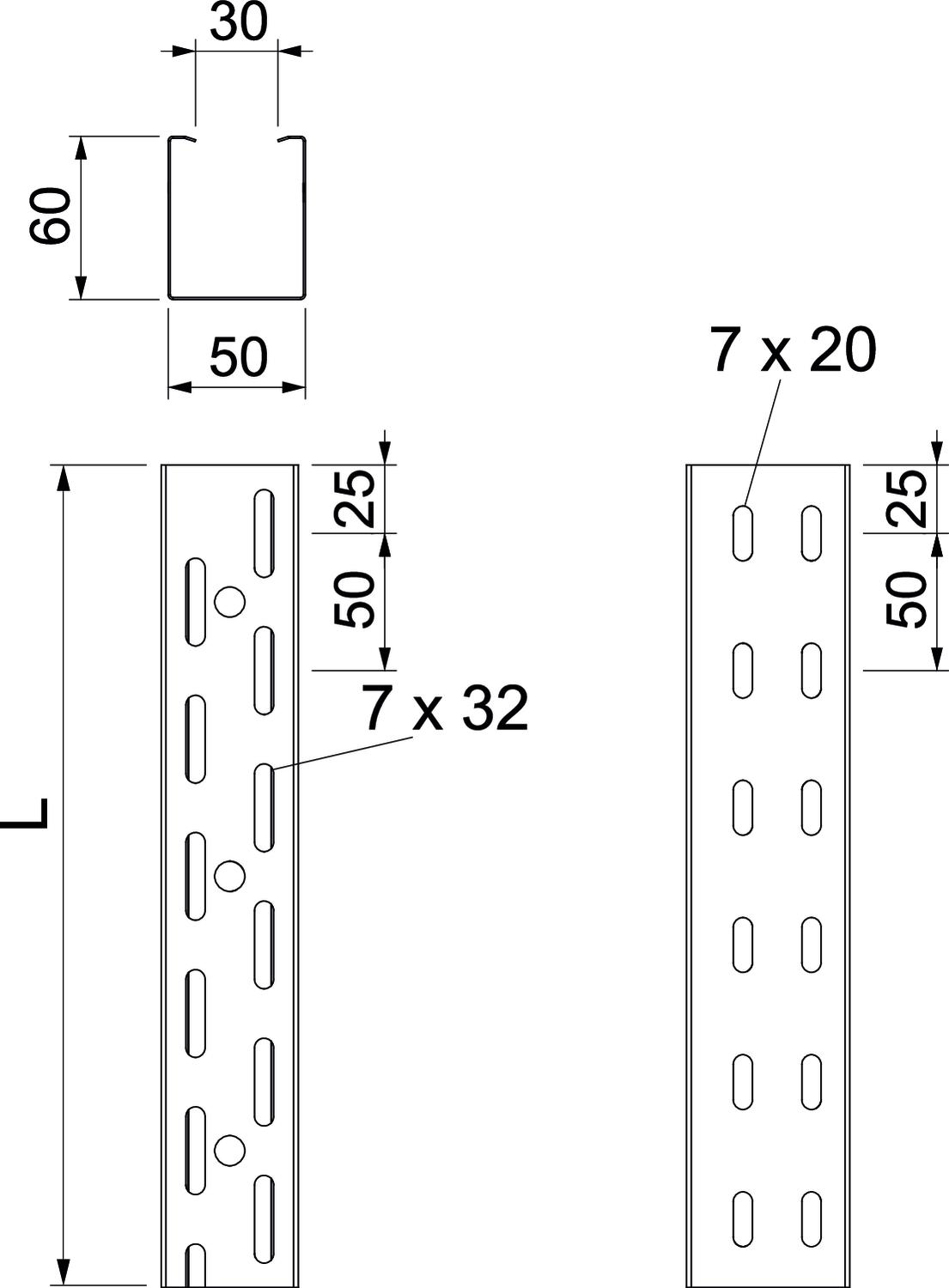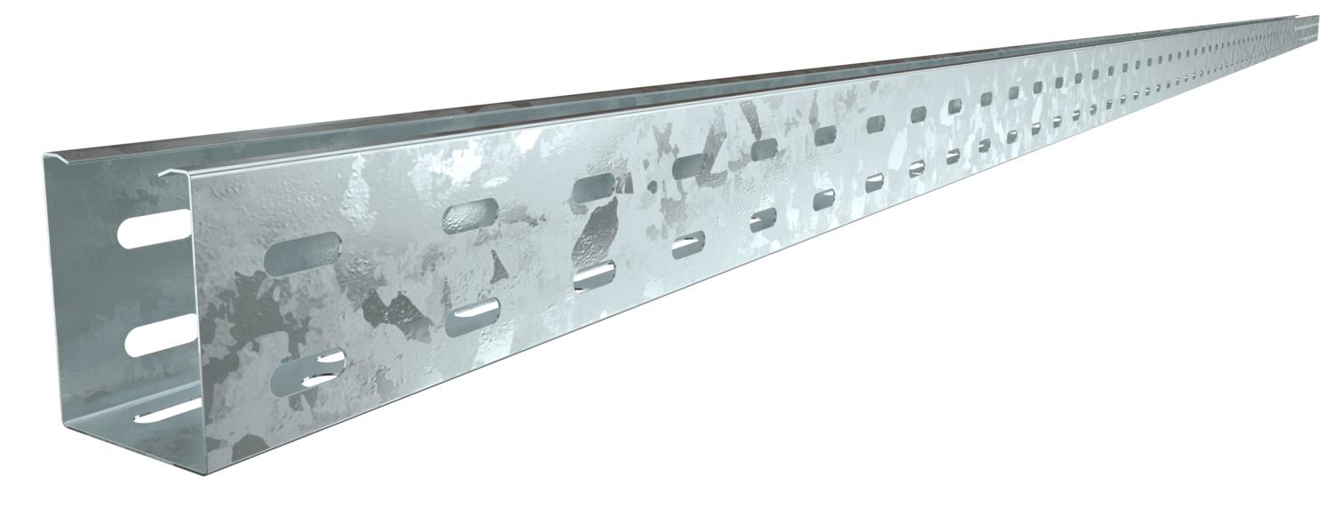 Caminho de cabos em chapa com perfuração continua na base e na lateral, bem como perfuração no meio (Ø11 mm) da base para fixações adicionais.