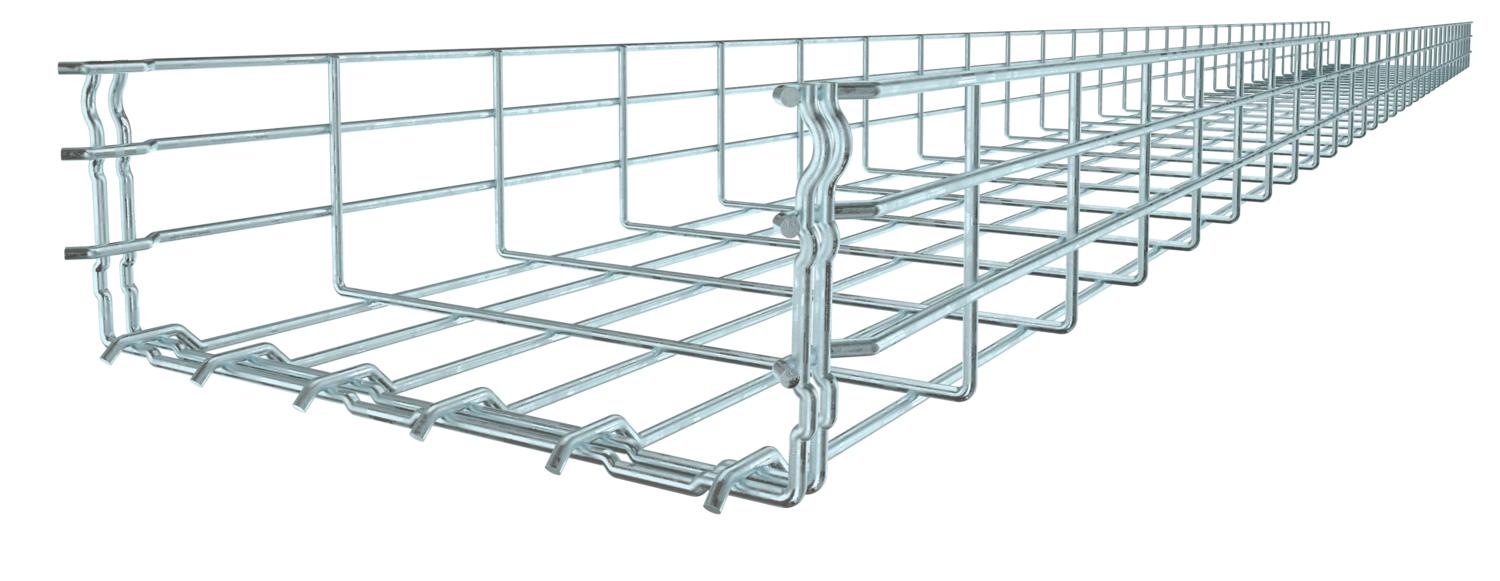 Para o caminho de cabos em varão não são necessários outros componentes de ligação, estes são simplesmente encaixados uns nos outros. A largura de malha é de 50 x 100 mm.