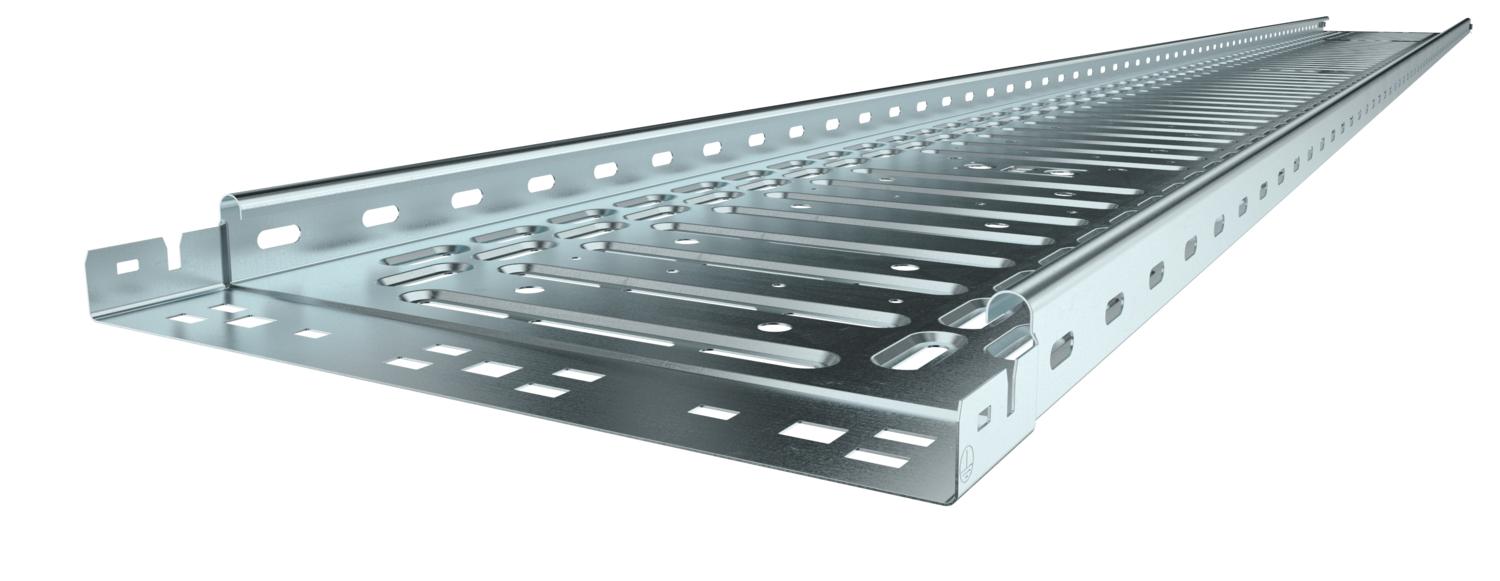 Caminho de cabos em chapa com união de encaixe rápido integrada. O comprimento útil do caminho de cabos em chapa é de 3.000 mm.
