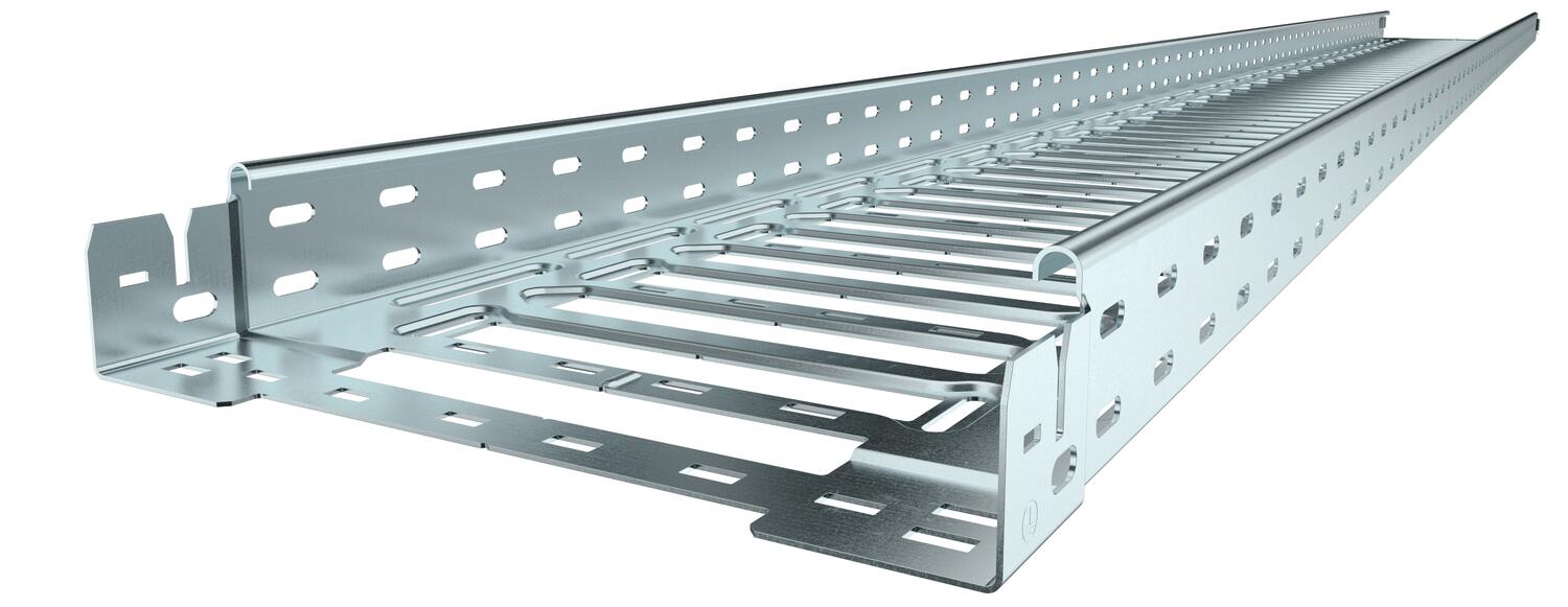 Caminho de cabos com largura de 200 mm com perfuração de 30%, de acordo com a diretriz VdS 2092, adequado para uso em sistemas de aspersão.