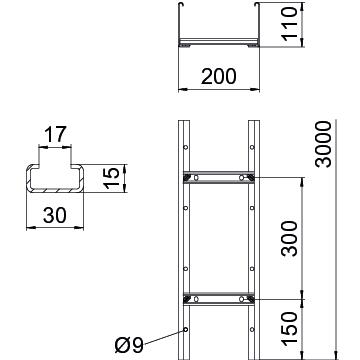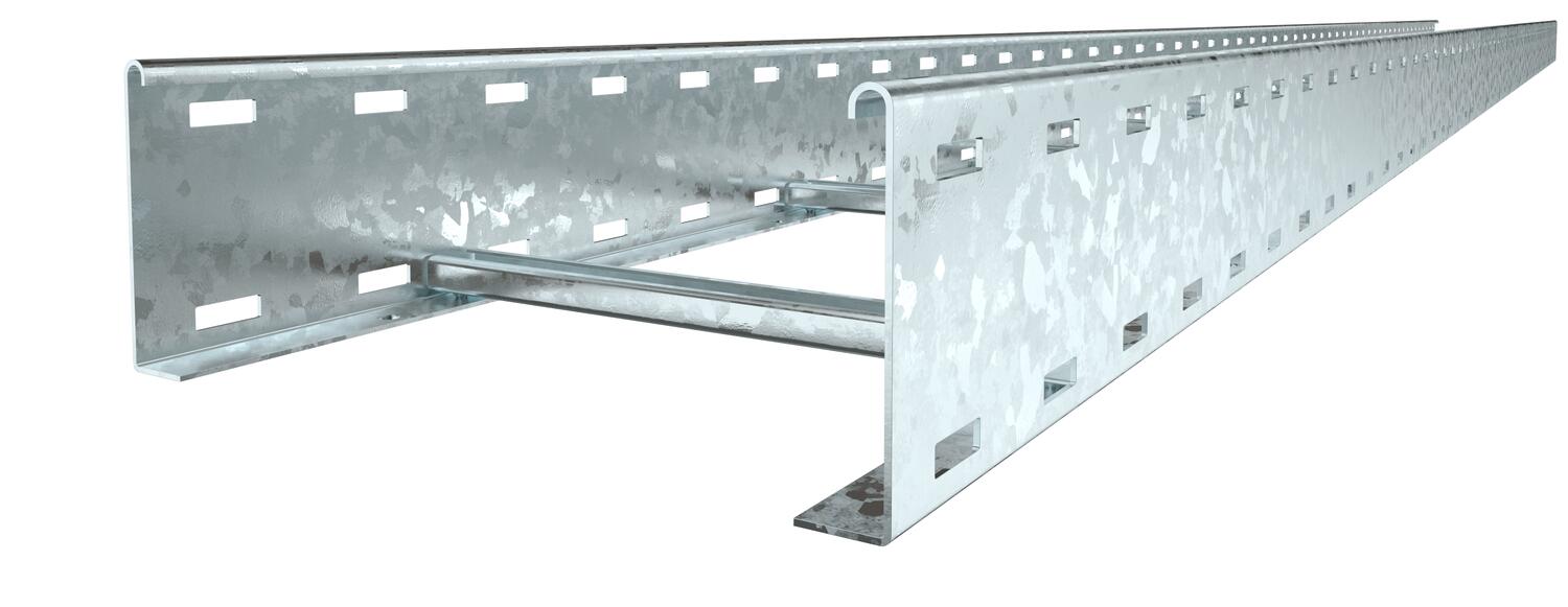 Caminho de cabos tipo escada com altura lateral de 110 mm com perfil separador C30 soldado e rebitado para cima. Travessa lateral revirada para reforço e como proteção de arestas. A fixação na consola é efetuada com peças de aperto do tipo LKS 40. A dimensão da ranhura do degrau é de 16,5 mm e a abraçadeira BBS adequada é a do tipo 2056.