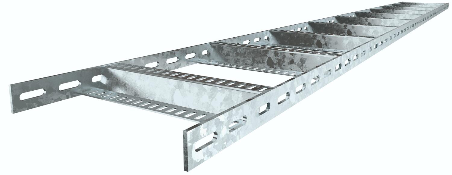 Caminhos de cabos tipo escada para construção naval, pequenas cargas, com aba perfurada de altura lateral de 40 mm, com degraus em Z soldados e perfurados. Carga verificada de acordo com a IEC em combinação com conector do tipo SLV.