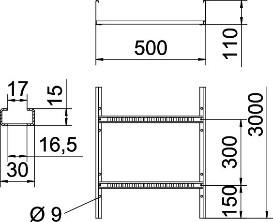 Descrição do produtoCaminho de cabos tipo escada com aba perfurada de 110 mm, degraus do perfil C abertos para cima.