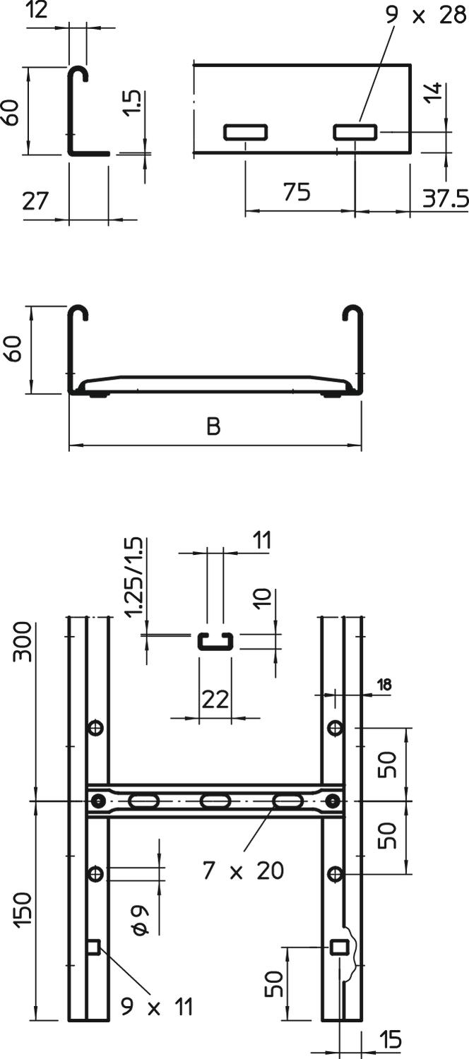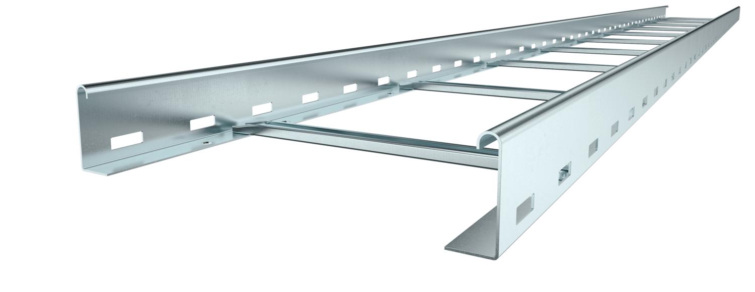 Descrição do produtoCaminho de cabos tipo escada com aba perfurada de 60 mm com degraus do perfil C rebitados e abertos em cima (versão NS).