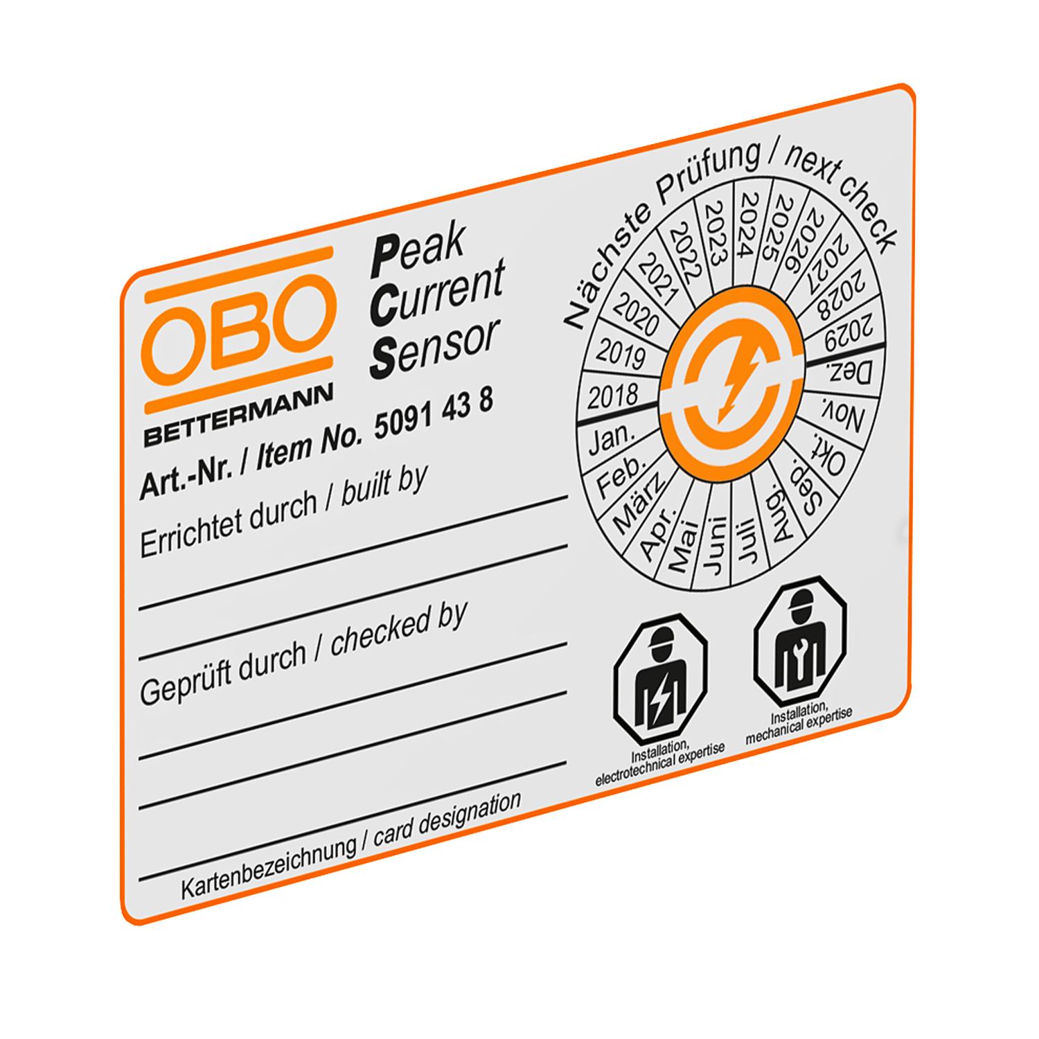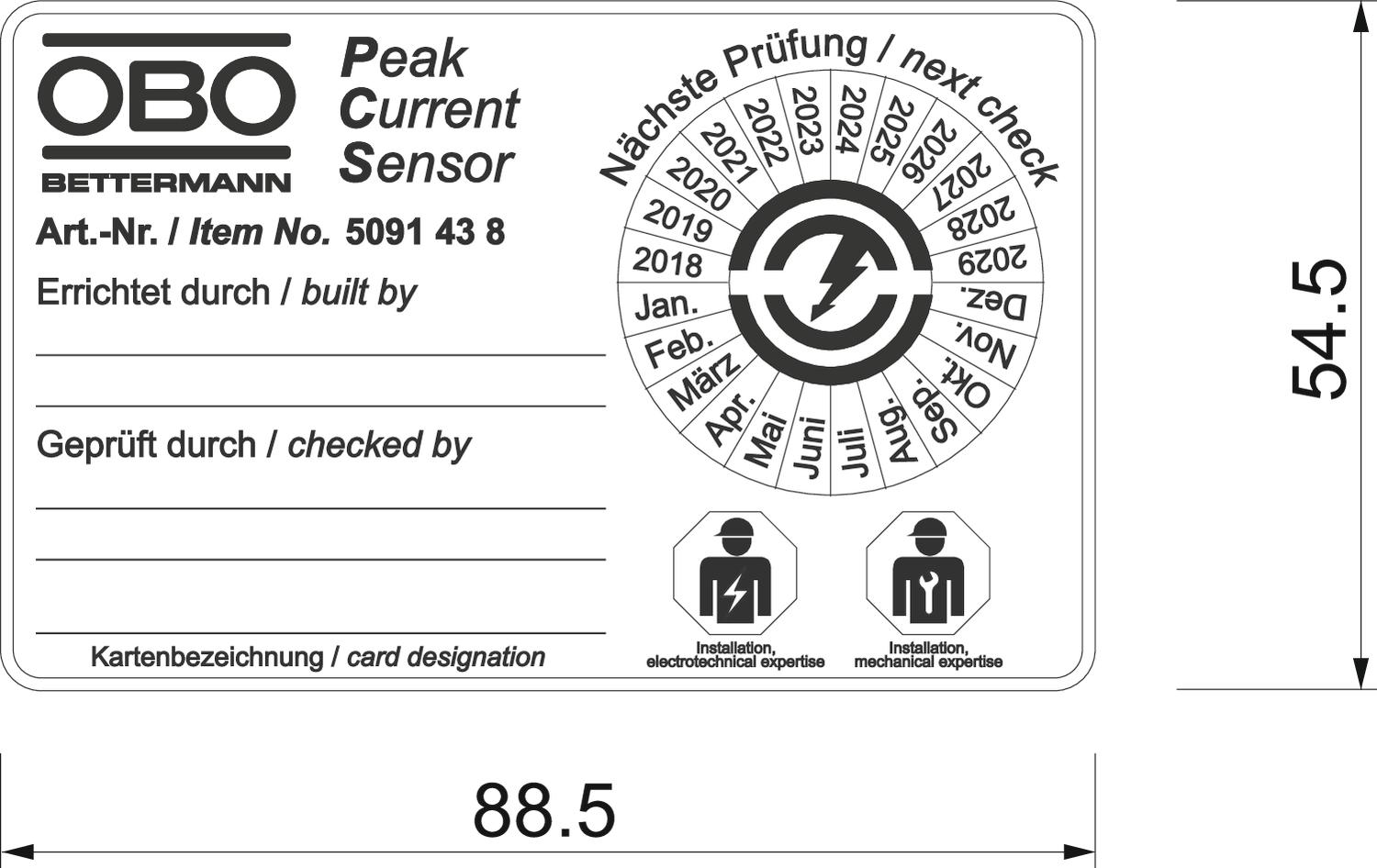 Descrição do produtoCartão do sensor de corrente de pico (PCS) para registo de correntes de impulso/descargas atmosféricas. O controlo constante sobre se uma descarga atmosférica entrou ou não no sistema de proteção contra descargas atmosféricas e o quão alta foi a última corrente da descarga atmosférica em kA pode, portanto, ser facilmente realizado pelo operador da instalação, pela empresa especializada em proteção contra descargas atmosféricas ou por peritos. Neste caso, o ciclo de manutenção impresso assim como os campos de inscrição apoiam os trabalhos de manutenção a efetuar em intervalos de tempo definidos de todo o sistema de proteção de raios, conforme a VDE 0185-305-3 (IEC / EN 62305-3).