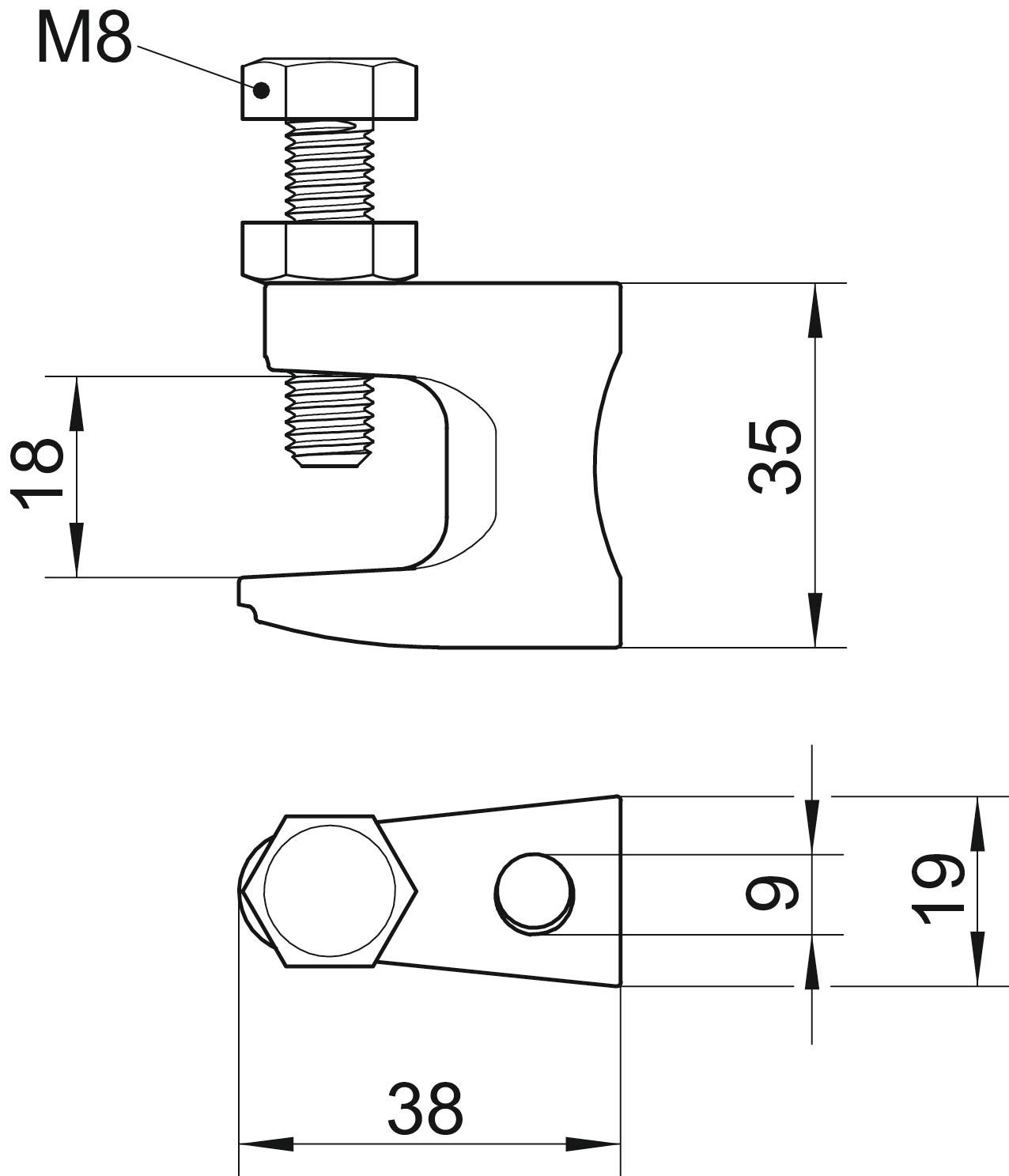 Altura 35 mm Carga de rutura 1,2 kN Comprimento 38 mm Dimensão 0-17mm Dobradiça não Dobradiça ajustável não Espessura do flange F máx. 18 mm Furo de fixação 9 mm Largura 19 mm Material Ferro maleável Máx. Binário de aperto 8 Nm Medida B 19 mm Medida D 9 mm Medida F 18 mm Medida G (mm) M8 Medida H 35 mm Medida L 38 mm Rosca M8 Rosca métrica 8 Tipo de fixação aparafusar Tipo de ligação do componente Furo - Todos os tipos