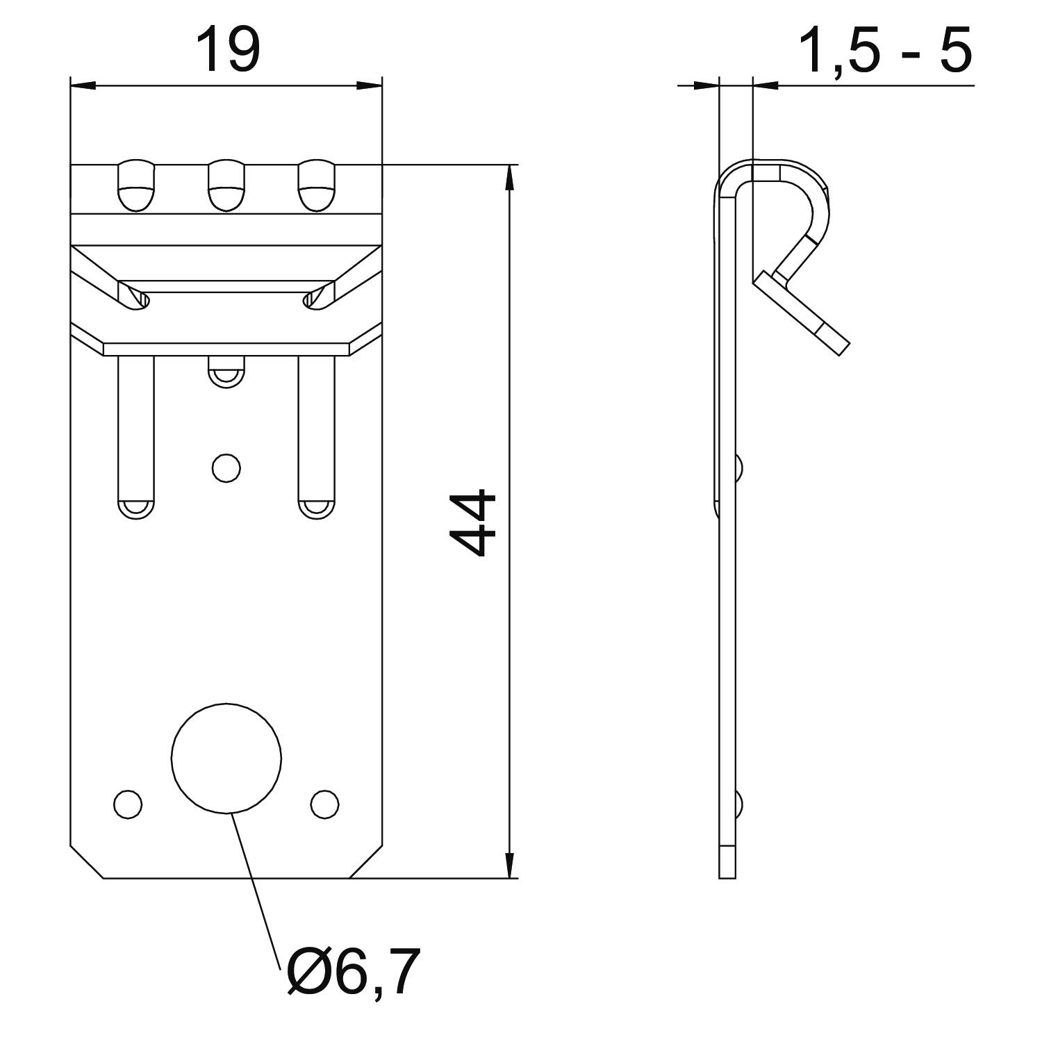 Altura 8 mm Carga de rutura 0,72 kN Comprimento 44 mm Cor zinco Dimensão 1,5-5mm Dobradiça não Dobradiça ajustável não Espessura do flange F máx. 5 mm Espessura do flange F mín. 1,5 mm Largura 19 mm Material Aço Superfície Lamela de zinco Tipo de fixação apertar Tipo de ligação do componente Furo - Todos os tipos