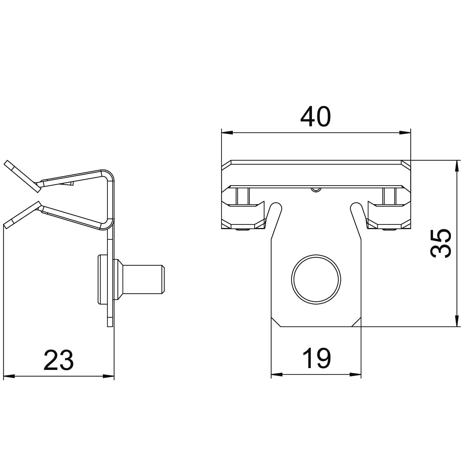 Descrição do produtoClip de suspensão com perno roscado M6 na lateral para soluções de montagem personalizadas. Fixação a vigas de aço por martelagem.