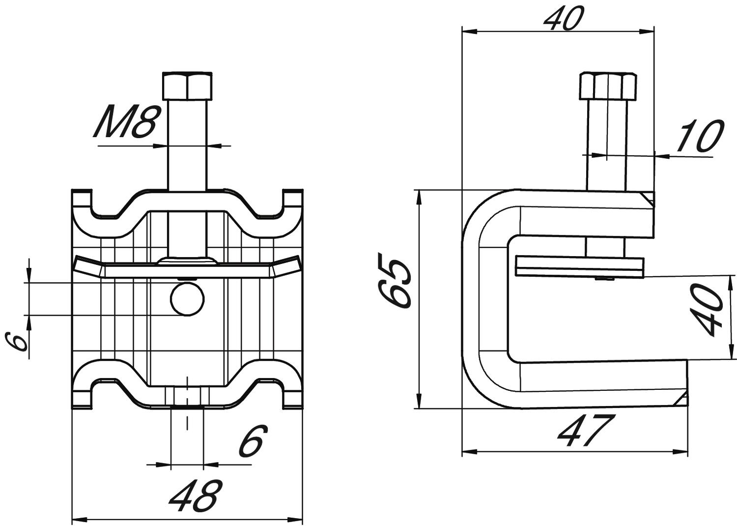 Descrição do produtoEste tipo de clip de suspensão é encaixado no apoio e fixo à viga ou ferro plano usando uma placa de pressão e um parafuso (M8). O parafuso hexagonal tem um WAF de 10 mm. No clip estão também incorporadas duas roscas M6 adicionais para, por exemplo, fixar um varão roscado.