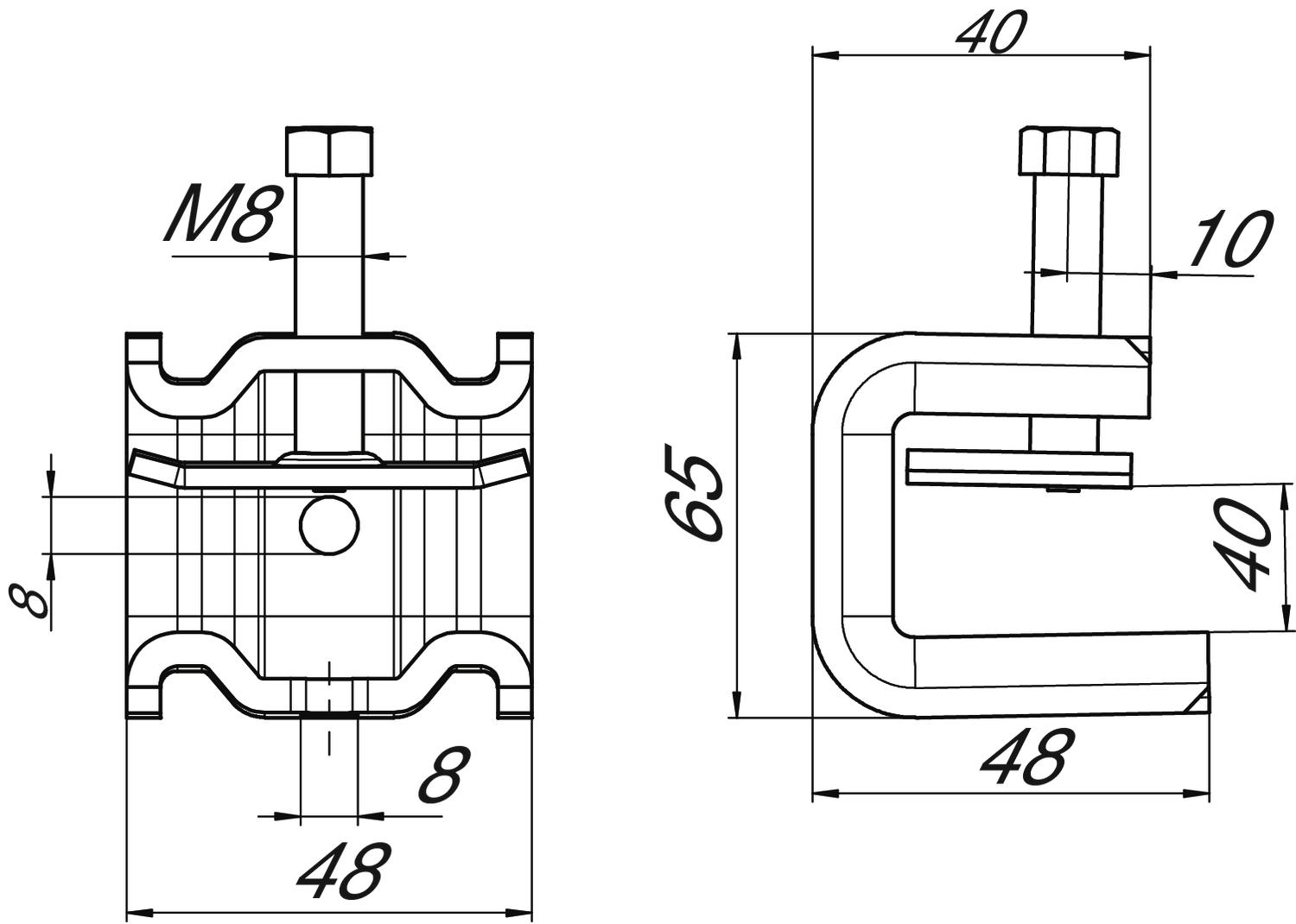 Descrição do produtoEste tipo de clip de suspensão é encaixado no apoio e fixo à viga ou ferro plano usando uma placa de pressão e um parafuso (M8). O parafuso hexagonal tem um WAF de 10 mm. No clip estão também incorporadas duas roscas M8 adicionais para, por exemplo, fixar um varão roscado.