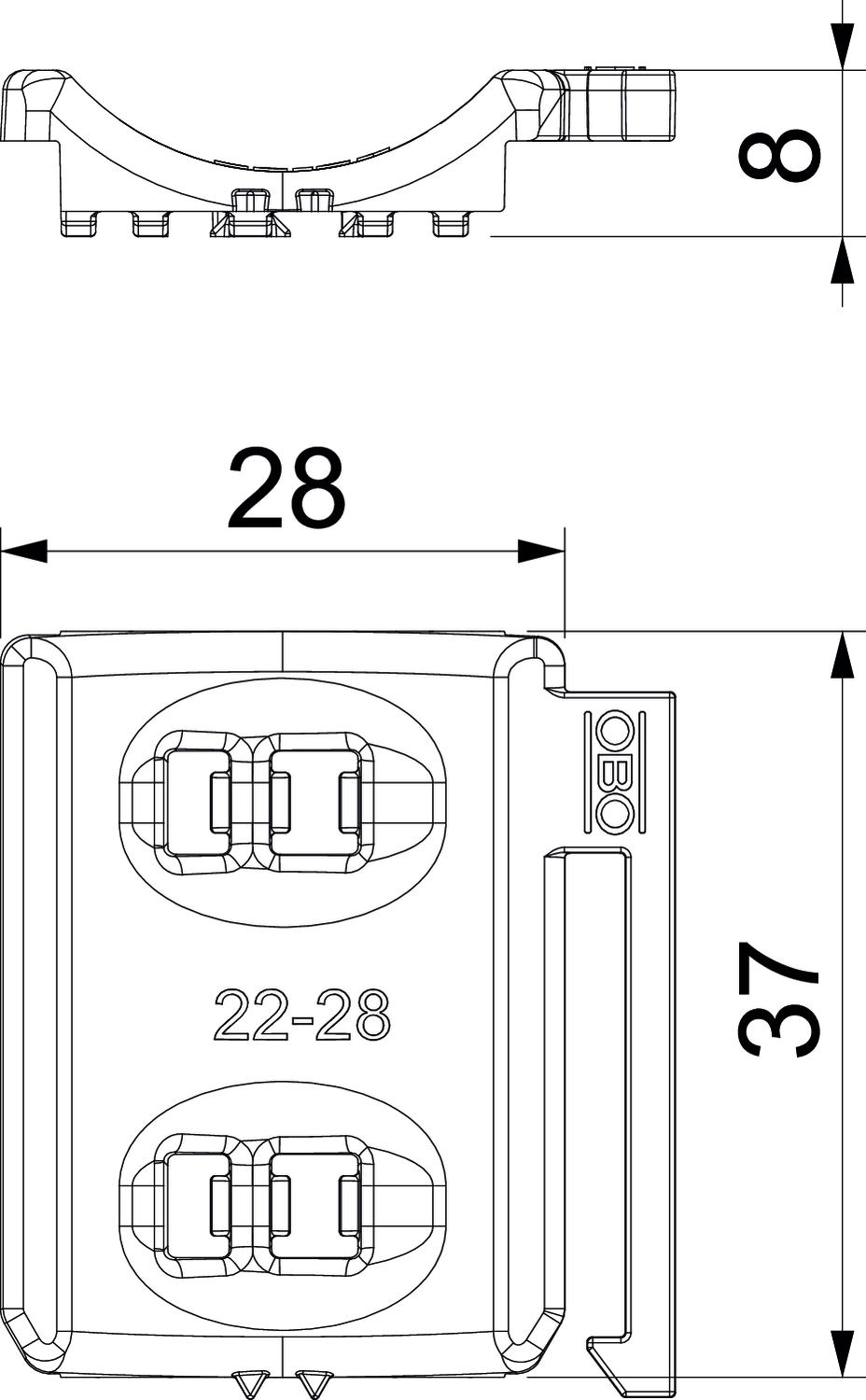 Adequado a diâmetros de cabo máx. 28 mm Cor cinzento claro; RAL 7035 Dimensão 22-28mm Intervalo de aperto D máx. 28 mm Intervalo de aperto D mín. 22 mm Material Polipropileno Medida B 33,5 mm Medida H 8,3 mm Medida L 37 mm Pegada de CO2 (GWP) do berço ao portão 0,0145 kg CO2e / 1 Peça Versão da contra placa/abraçadeiras Contraplaca - Todos os tipos