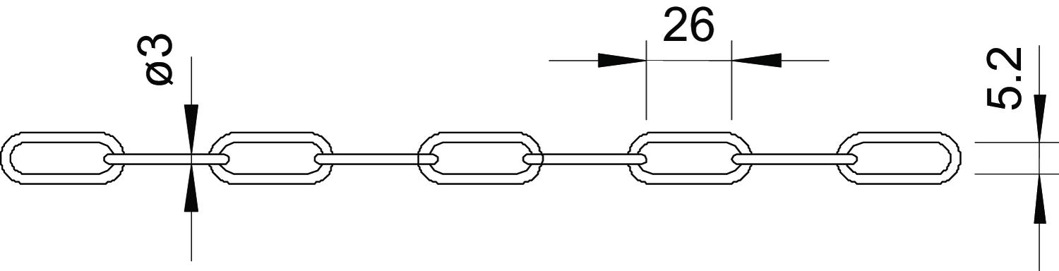 Carga de rutura 0,7 kN Dimensão 25x5,2mm Espessura do material 3 mm Largura 11,2 mm Material Aço Medida L 25000 mm Superfície eletrogalvanizado Versão Corrente de elos - Todos os tipos