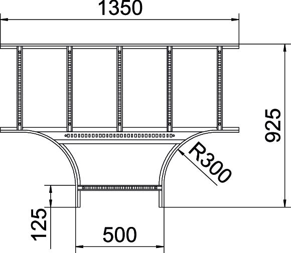 Descrição do produtoDerivação em T, horizontal, com degraus soldados para todos os caminhos de cabos tipo escada com uma altura lateral de 110 mm.