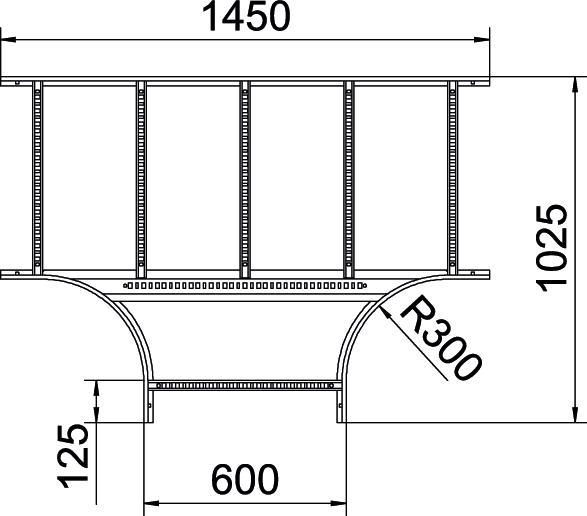 Descrição do produtoDerivação em T, horizontal, com degraus soldados para todos os caminhos de cabos tipo escada com uma altura lateral de 60 mm.