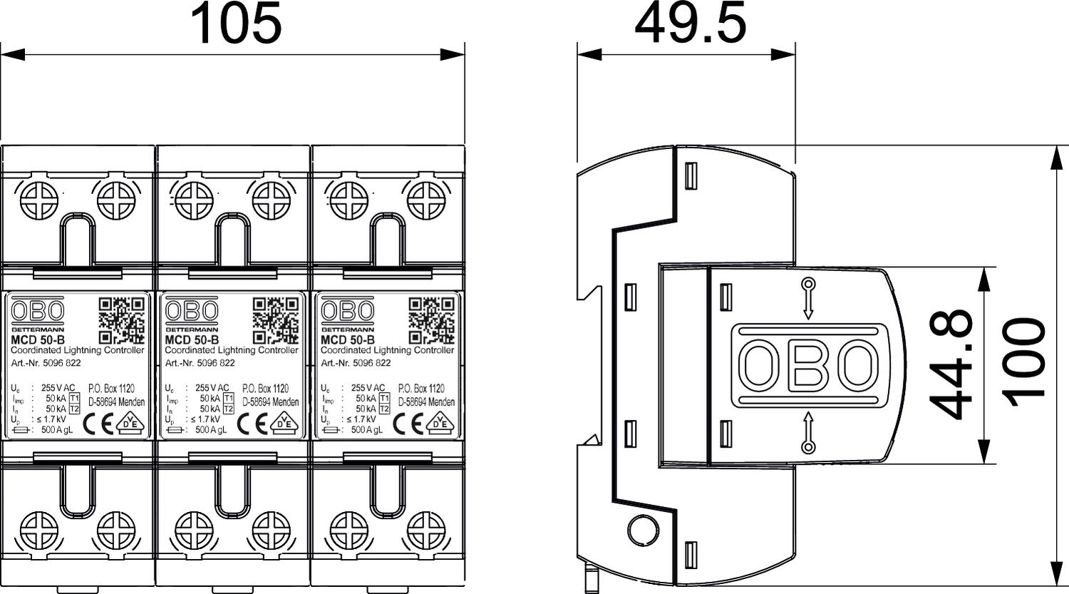 3 x MCD 50-B: descarregador de sobretensões do tipo 1+2 EN 61643-11. Para interface 0 em 2 (LPZ) de acordo com o conceito de zonas de proteção contra descargas atmosféricas conforme a IEC 62305 ou VDE 0185-305.