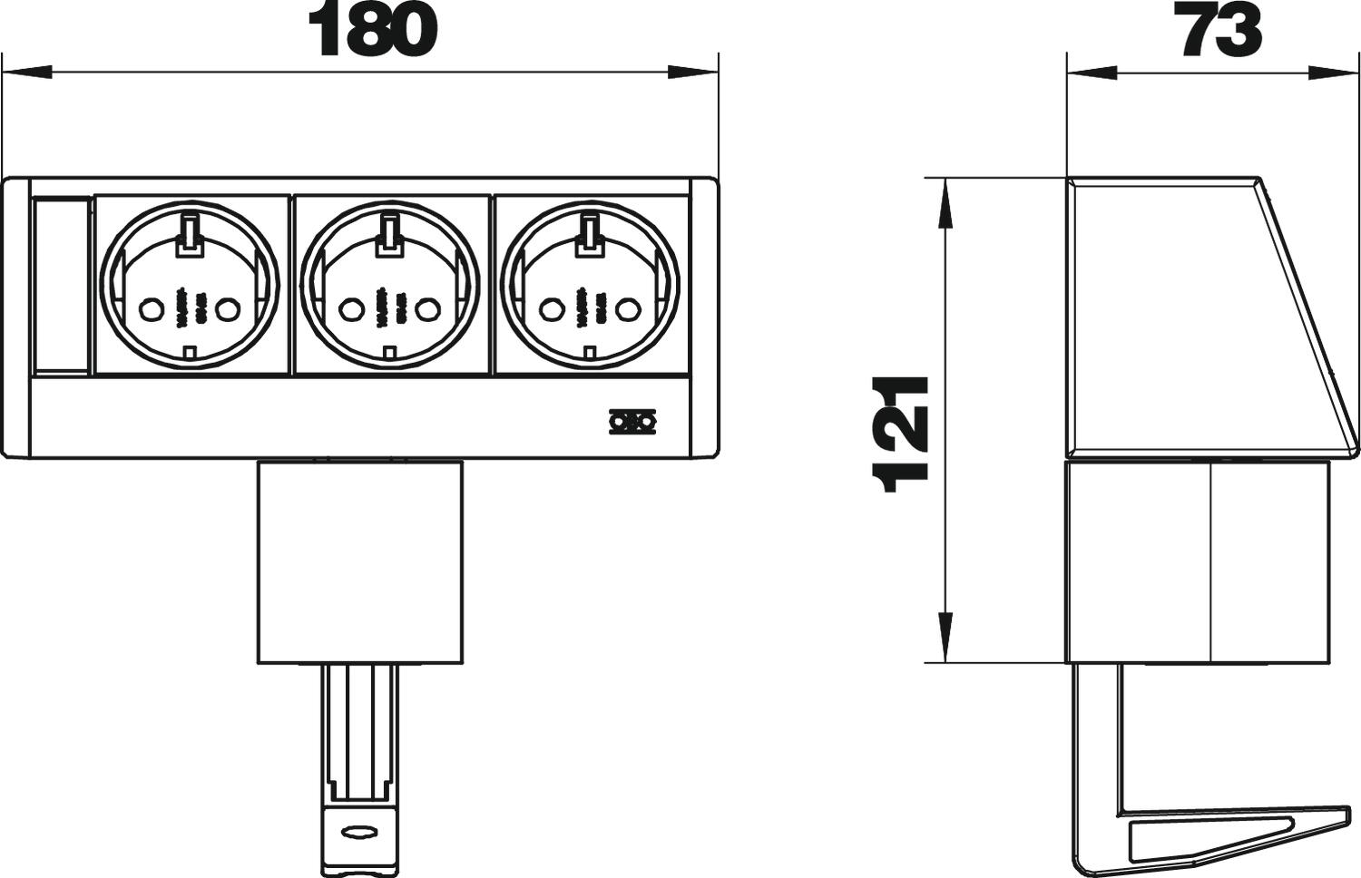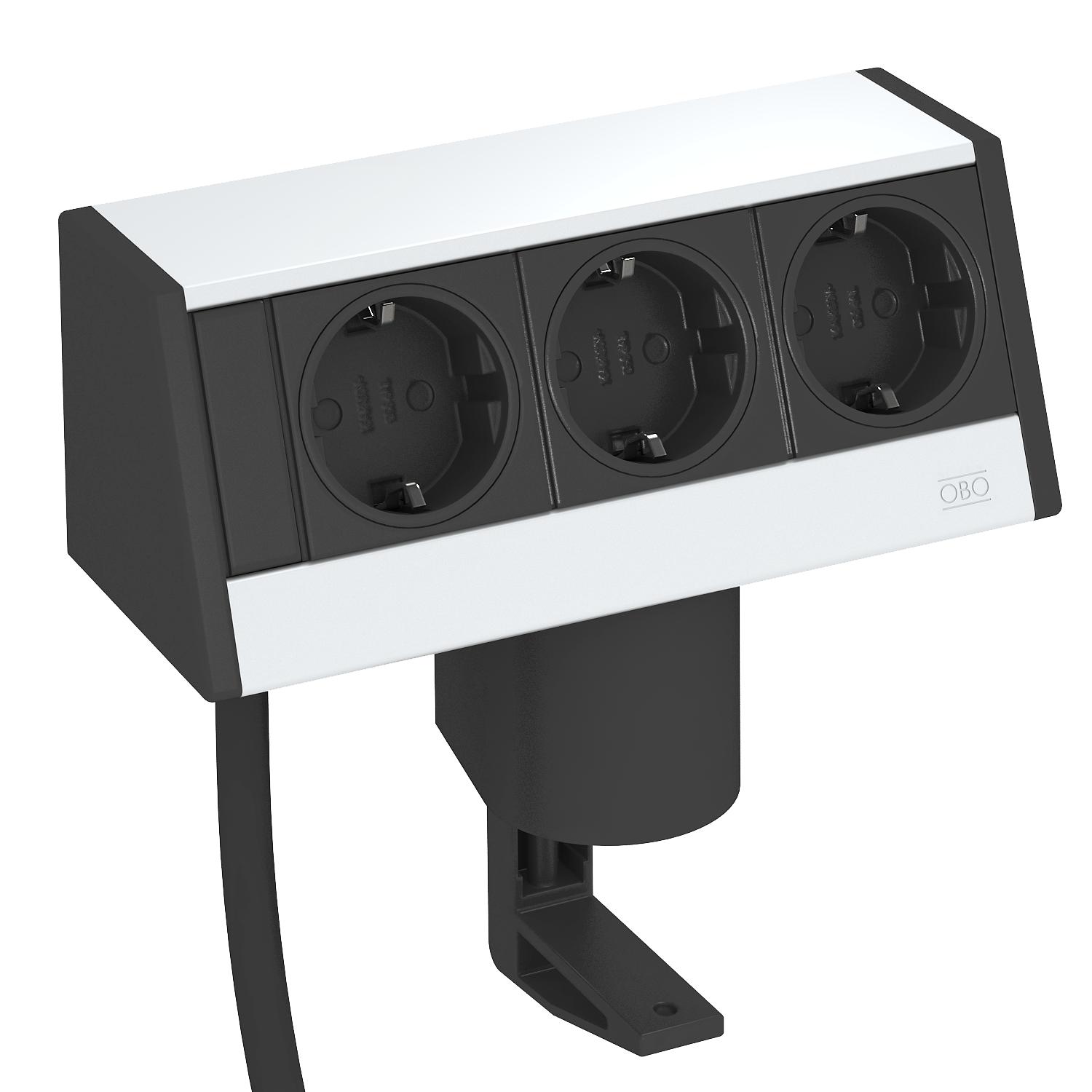 Descrição do produtoDeskbox com cabo de ligação, com uma patilha de fixação para mesas com espessuras de 8 até 40 mm, saída de cabo a partir do lado inferior no perfil.
