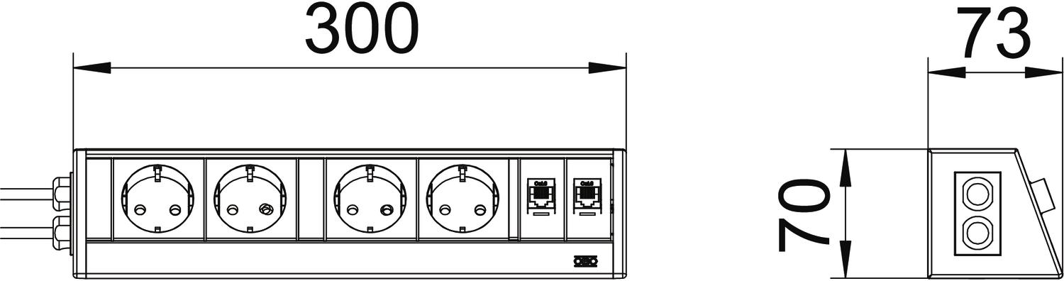 - duas tomadas pretas de energia com direção de encaixe 0°, incl. cabo de 3,0 m com ficha macho de saída lateral CEE 7/7, saída de cabos no lado esquerdo da cobertura da caixa.