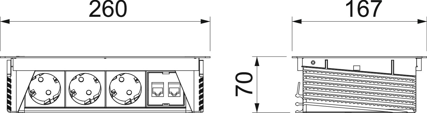 Comprimento 260 mm Comprimento da linha adutora 3 m Dimensão 260x167x68 Elevável sim Extraível não Material Aço inoxidável, livre de ferrugem 1.4301 Número de ligações CAT 6 2 Número de tomadas SCHUKO 3 Profundidade de instalação 68 mm Proteção contra sobretensões não - Todos os tipos
