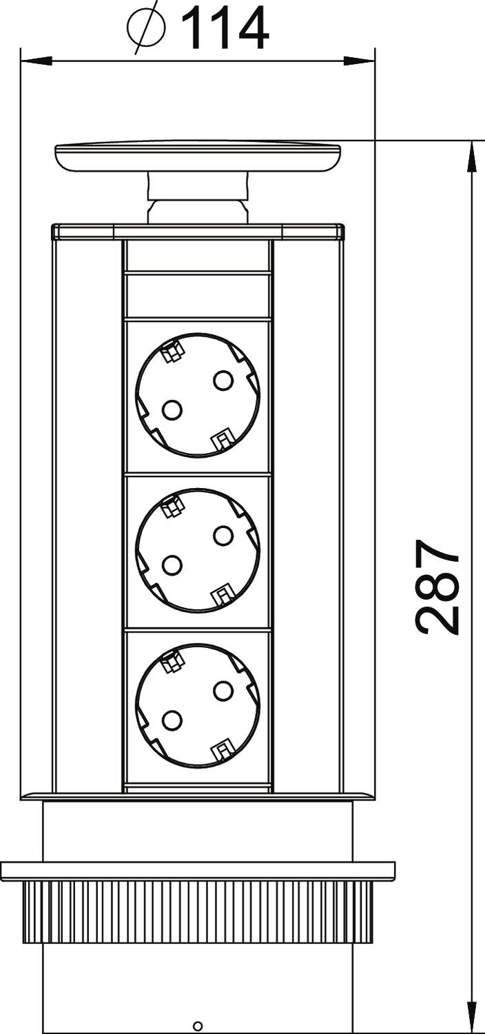 Comprimento 287 mm Comprimento da linha adutora 3 m Cor alumínio Diâmetro exterior 114 mm Elevável não Extraível sim Material Alumínio Número de tomadas SCHUKO 3 Proteção contra sobretensões não Superfície anodizado Versão Tampa em aço inoxidável - Todos os tipos