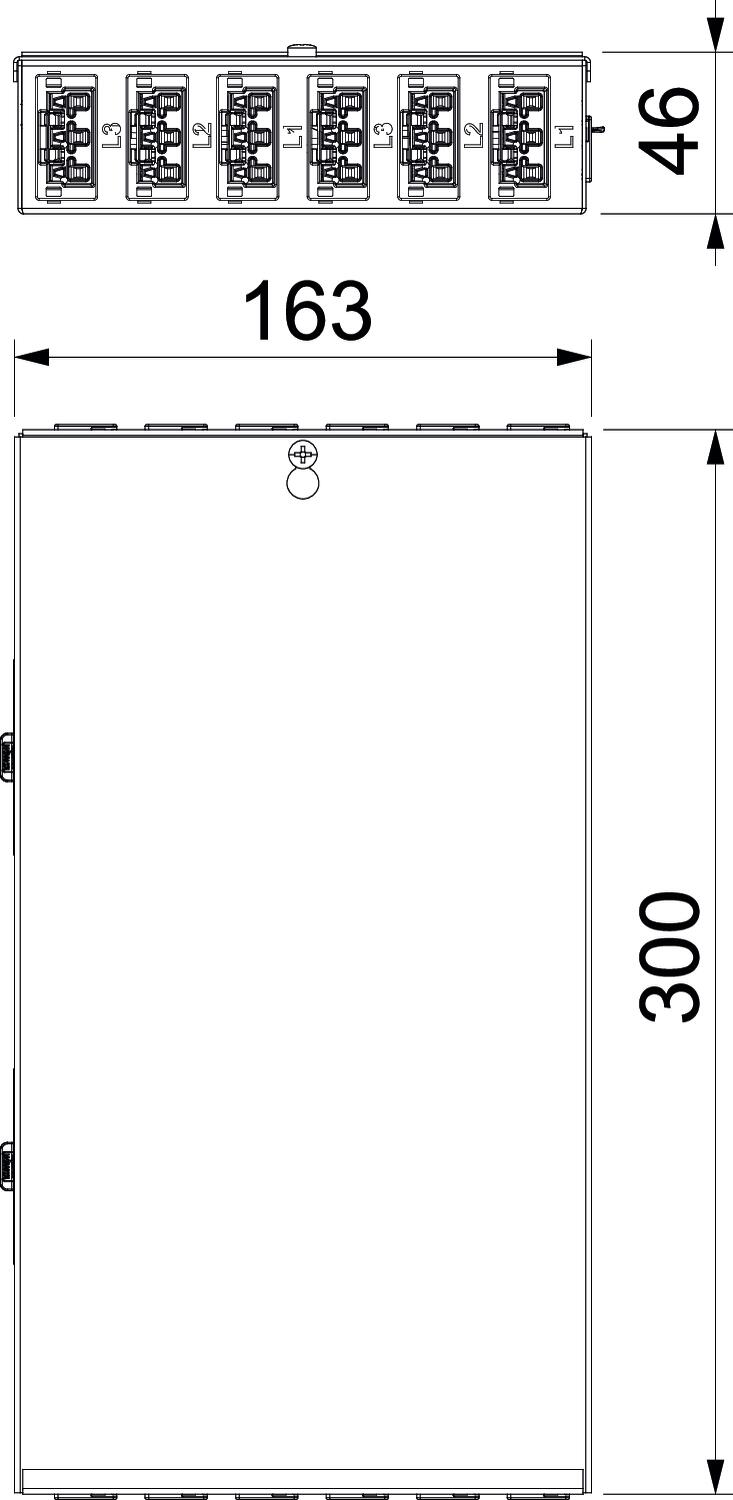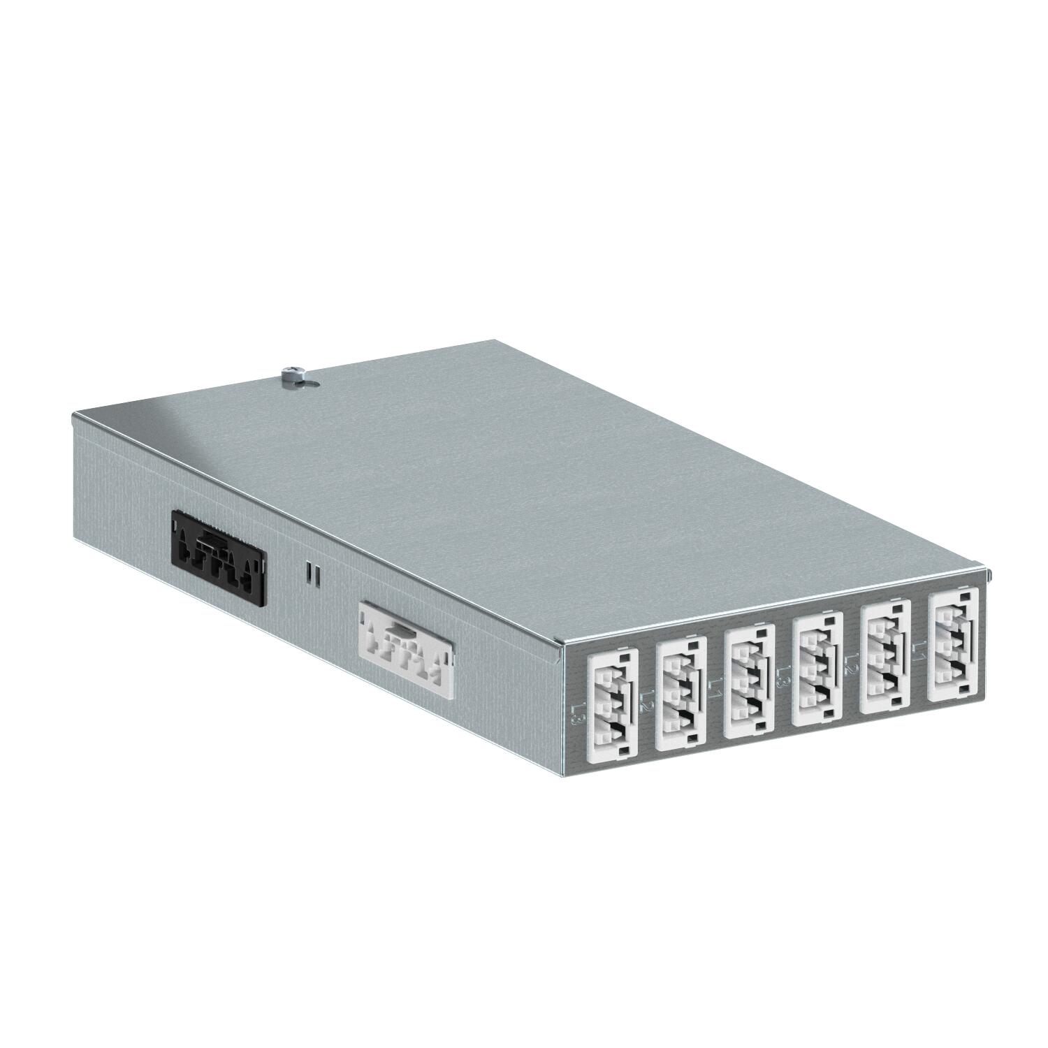 Saída: 12 conectores de ficha de bloqueio automático 3 polos em (6 x) e preto (3 x), 25 A, tipo WINSTA MIDI