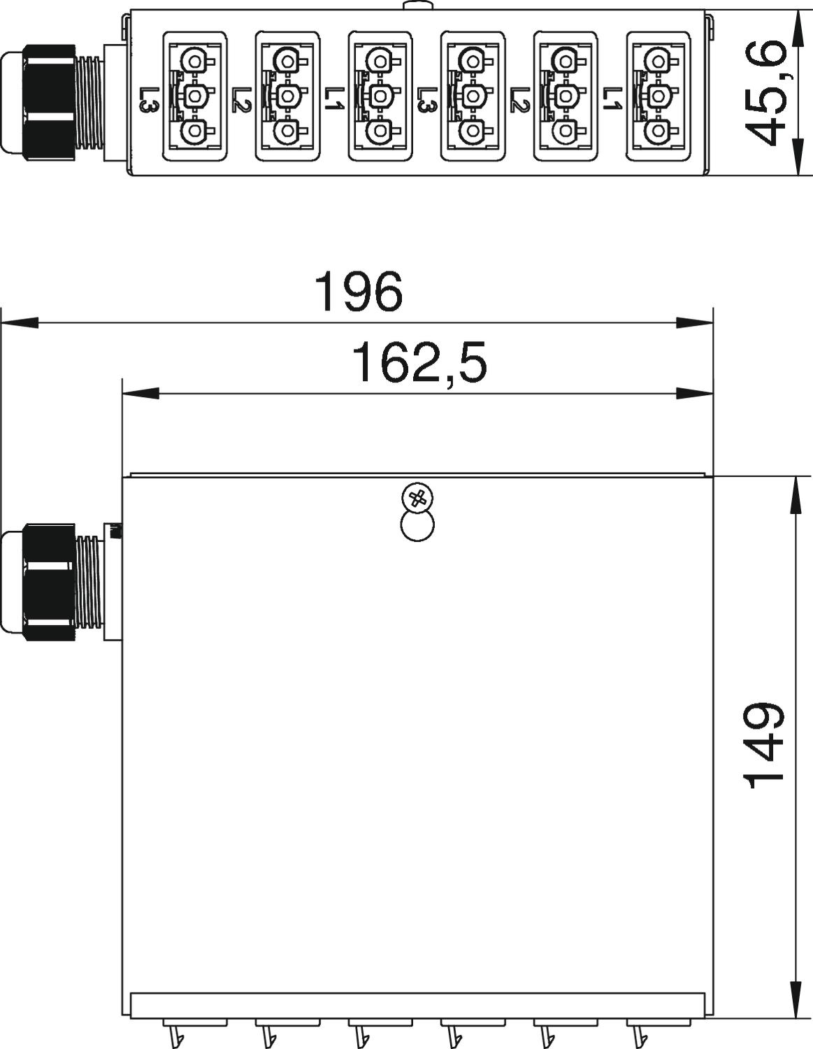 Saída: 6 conectores de ficha de bloqueio automático, com 3 polos, preto, 16 A, tipo GST18i (tomada: 2 x L1, 2 x L2, 2 x L3).