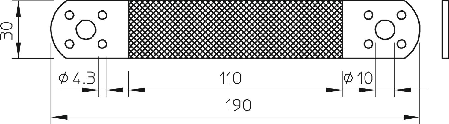 • Em cada extremidade 1 orifício de fixação Ø 10 mm e 4 orifícios de fixação Ø 4,3 mm
